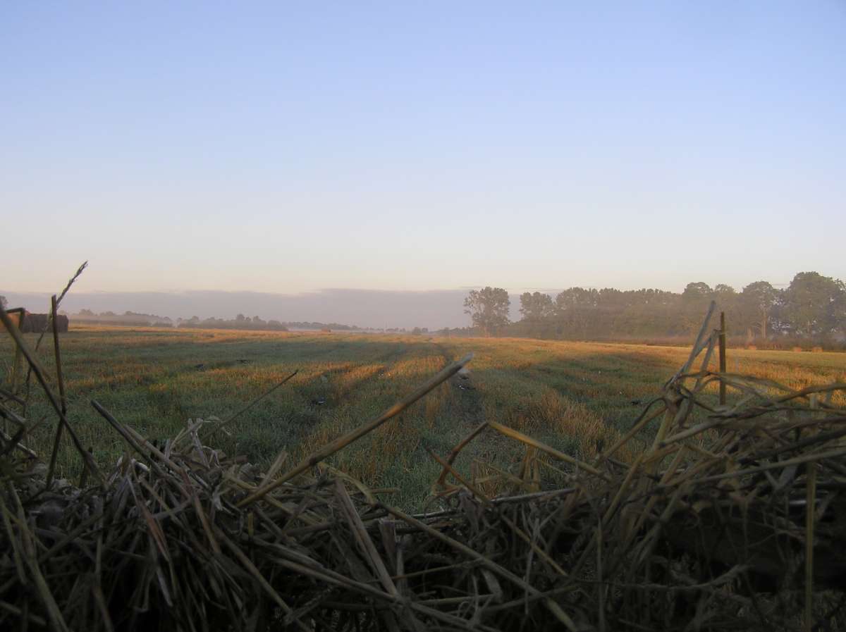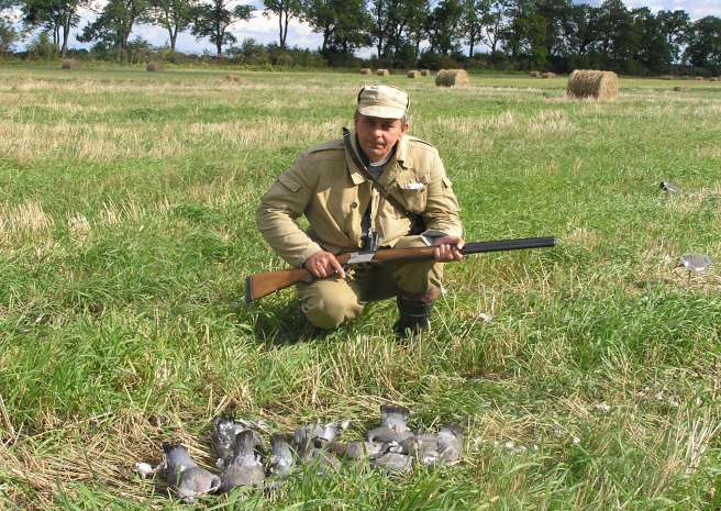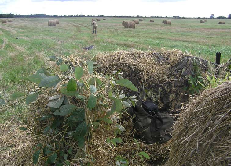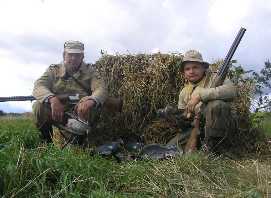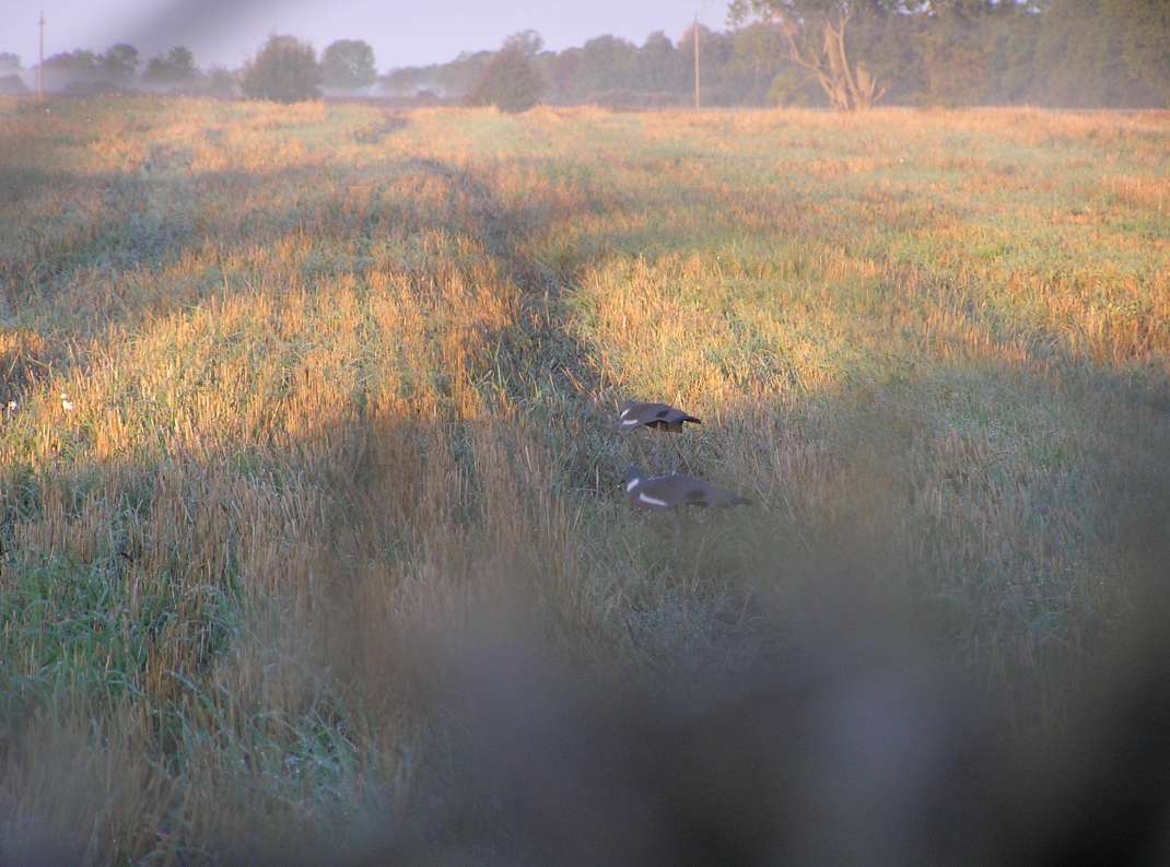 Бекаса самотопом тоже рановато , рябчика в лесах почти нет, да и охота на него тут запрещена,тетерева и глухари живут гораздо севернее, гусь пока не полетел. Остаётся только вяхирь. Ранее успешно охотился на него когда он летит на юга вдоль Балтики, или просто под одиноко стоящим на поле сухим деревом, на которое он любит присаживаться после кормёжки. На сей раз решили с товарищем посетить поля. Смотался в пятницу на разведку, а он там мало-мало есть. Сказано- сделано, берём путёвки и в 6 утра в субботу стартуем на поле. Там всё просто, быстренько у валков на стерне на вырубленные колья бросаем сетку, расствляем имеющейся минимум полукорпусников( 7 шт.) и объёмников(3шт.), садимся на раскладные стульчики в скрадок, пьём чай и ждём... Оказывается он не просто случайно налетает под выстрел, а так прикольно заходит как утка на чучела.