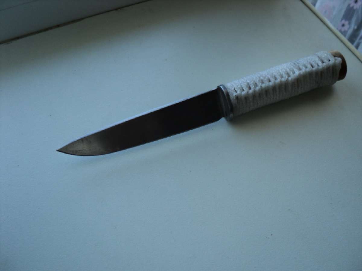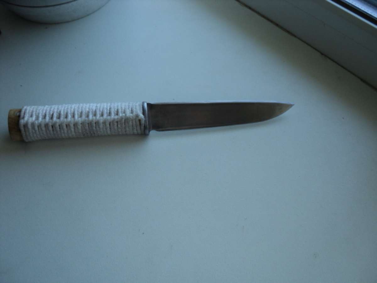 Не специалист по ножам, для себя иногда делаю. Почти 2 дня ковырялся с этим ножом, сталь-полотно Японского промышленного рубанка, закалка примерно 58-59 ед (алмазный надфиль не берёт) один не достаток, темнеет. Ради эксперемента ручку сделал плетёную, чтобы не скользила, не понравится, переделаю.