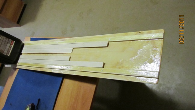 Это можно будет решить пустив дополнительную полосу фанеры в качяестве ребра жесткости по верхней стороне лыжины.