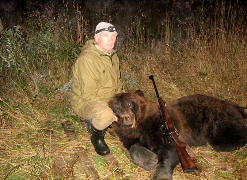 Наконец то удалось выехать на охоту, фактически это первый выезд в этот сезон. Само открытие задержалось на три недели из-за жары и пожаропасной обстановки. Тем не менее овсы наши вполне приличные и медведь активно на них ходит. Собравшись втроём уехали на три-четыре дня. В первую половину дня собирали грибы, вспахали зябь на новых участках для посева подкормочных овсов в 2011 году, а приблизительно в 16 часов садились на лабазы. Первые два вечера ничего особо интересного для выстрела не желало появляться, на овсы приходило кормиться большое количество глухарей, прилетали тетерева. Дополнительно мы высыпали на сеянные участки для подкормки разной живности зерно - пшеницу, овёс, рожь, так что желающих подкормиться нашлось много, но приличных медведя и кабана не появлялось. Наконец на третий вечер совершенно неожиданно на поле выкатился подходящий экземплярчик представителя медвежьего племени и уставился на меня, по крайней мере мне так показалось. С минуту он смотрел в мою сторону, а потом удалился с поля так же быстро как и вышел. Учитывая что я слегка дремал и карабин находился крайне не в удачном положении, то выстрел произвести не удалось. Минут через сорок этот тип вновь выкатился на поле сбоку от меня буквально метрах в 15-20. Он видимо с тыла изучал место, которое ему показалось подозрительным, но я не дал ему оснований сомневаться в том что "я тучка, тучка, тучка". Однако он вновь стал разворачиваться к лесу, поэтому пришлось срочно произвести выстрел.