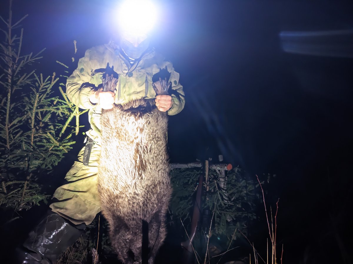 Добрый вечер всем бобронарезным! Поделюсь своей историей. Убирать бобров начал с конца октября, первого почти взял на кормовом зимнем складе-кормушке. Кормушка собрана мохнатым семейством весьма солидная: от берега и до дальнего края метров 6-7, переплетена до самого дна - примерно 1 - 1,3м, можно по ней ходить яко по плоту. На берегу, в 15м от кормушки стоит здоровая елка, под ней я и устроил засаду. Время выхода бобров разведал заранее. Пришел, расположился, жду. Край пруда, на котором поселилось это семейство уже затянуло первым льдом - выход бобров слышно, первым делом они почему-то "балуются" со льдом, хотя вся гладь пруда - открытая вода. Первым вылез на кормушку щегол(еток), усроился удобно, грызет. Брать его не стал, ждал большого и он таки пришел, примерно через час, рыкнул на пацаненка - того ветром сдуло. Забрался на кормушку и давай верхние бревна перекидывать, а бревна не хилые, а он ими, как жонглер орудует. Дождался я, когда он выберет самое сладкое и по-хорошему вгрызется, включил фонарь, прицелился в голову, стрельнул. Альфа бобр свалился с кормушки и затих, НО!!! пока я расправлял свои ботфорты, он вздумал заагонизировать, при этом весьма мощно и умудрился занырнуть в кормушку...не всплыл ни чуть погодя, ни к утру. Пытался утром шарить богром по кормушке - бесполезно - хитросплетено все. Стрелял из Тоз-78, Охотником 370, дистанция 15м. Второго бобра охотил на речке, вытекающей из этого пруда, знал заранее, где и когда он выходит. Караулил его со ствола вывороченной по весне елки, прячась за корнями. Слышал, как выходил, видел, как возился подо мной, дождался, когда вылезет на берег к поваленной осине и начнет ужин. Включил фонарь, прицелился, стрельнул. Погиб бобр сразу - пуля разделила позвоночник на две части. Стрелял из Иж18-МН, 223 рем, бараульское "шило" 3,56 гр, дистанция 10м. Бобрик вывесил 27 кг. Третьего бобра подловил на ночном переходе через прудовую дамбу из пруда в речку. Стрелял в 01-30 ночи из под фонаря, из Тозика "Охотником 370", с дистанции 12м, стрелять пришлось "в лет", попадание в грудную клетку , в соединение сердца с легкими - жизни бобрику хватило только на последний прыжок в воду. Бобрик вывесил 20 кг. Пуля пробила ребра и застряла на выходе под шкурой, раскрылась грибком, ну прямо Лапуа! Публикую фото изъятых из природы бобров и пули.