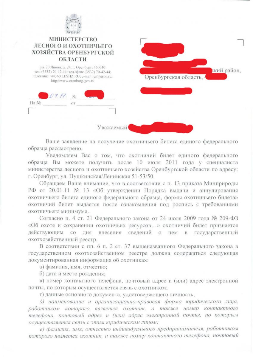 5.07.2011 подал заявление собственного сочинения, указав только то что просит Приказ МПР РФ N 13 и 209-ФЗ, пришлось перечитать всё и про реестр, и про порядок выдачи и даже осилил заголовок Приказа про охотминимум.