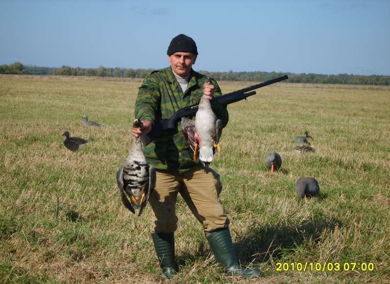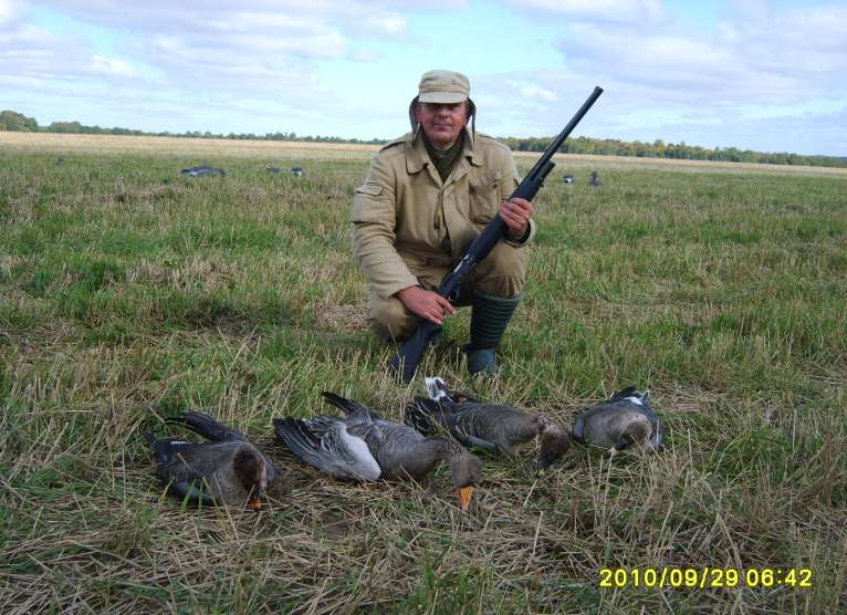 На сей раз едем с опытным товарищем, и весь путь обсуждаем на каком из полей сделать выбор, и как учитывать попутный гусю сильный ветер. В конце концов решаем встать на прежнее место, а там будем ориентироваться по обстановке. С рассвета гусь начинает часто тянуть большими стаями, но несмотря на низкую облачность идёт очень высоко. Думаем, что кушать они тоже захотят и решаем взять их измором. Однако у товарища не получается, т.к. часов в 10 его срочно дёргают на работу( долбанные мобильные телефоны), и он прыгает в джипарь, пообещав забрать меня часа в 2. Пришлось отдуваться самому. Сразу после его отьезда налетает стайка гуменников из которой удаётся выбить 2-х штук. Потом позорно мажу по другой стае. Через часок беру 1 серого, и через ещё пол часа гуменника. Итого к пол первого имею в наличии 4-х гусей, и со спокойной душой жду товарища, который в курсе событий из-за тех же мобильников, и психует со страшной силой, угрожая меня с поля не забирать. Прилетает весь в мыле к часу, но лёта увы уже нет, и двигаем домой с большими надеждами на субботу - гусь то весь в Питере ещё не пролетел???