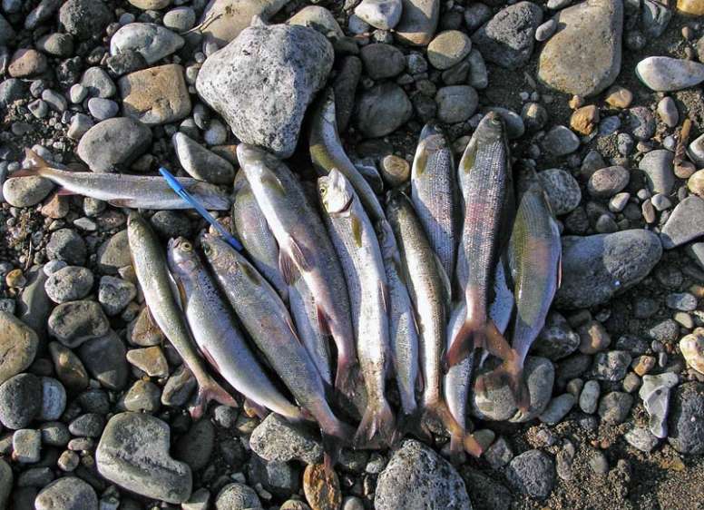 В основном, здесь у берегов ловится хариус, но в этот день мне попались и несколько омулей. Хариус средний, 200-400 грамм.
