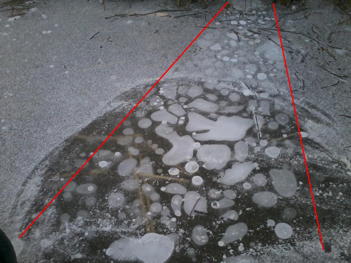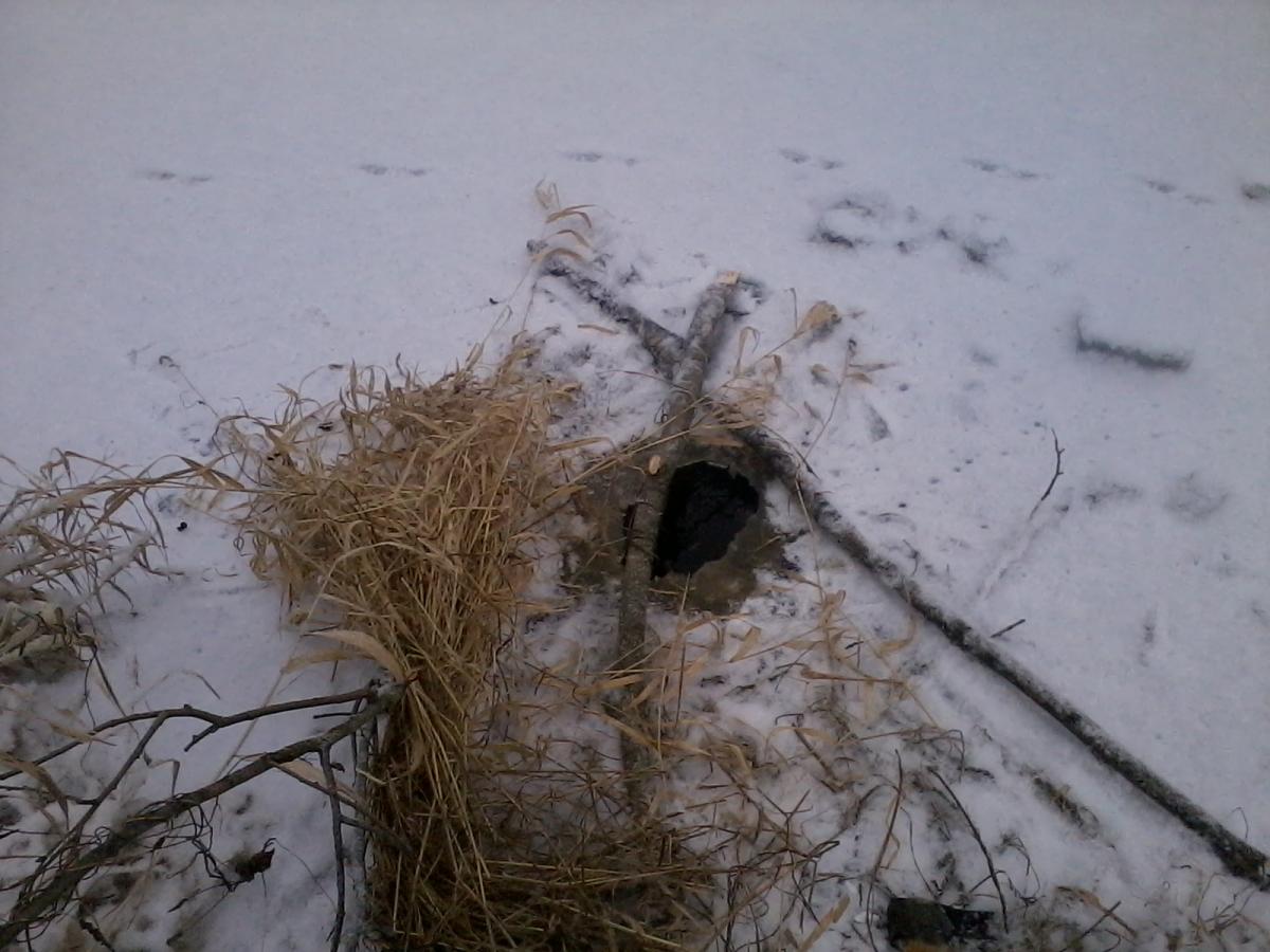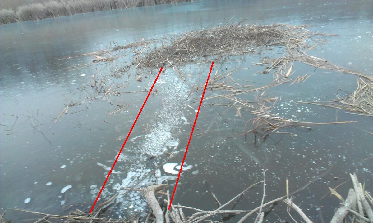 С пузырями всё понятно! Я думаю как ставить возле заготовленного корма? Там он двигается хаотично и на разной глубине, ведь ветки тоже лежат беспорядочно! И если его не заманивать в рамку, то получается, что он туда попадает чисто случайно? И чем больше натыкаешь капканов, тем выше вероятность его поймать?Пузыри показывают тропу бобра подо льдом.