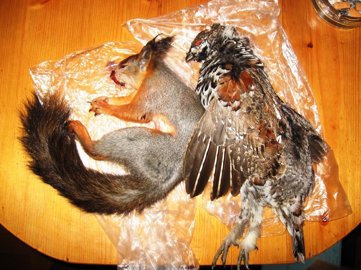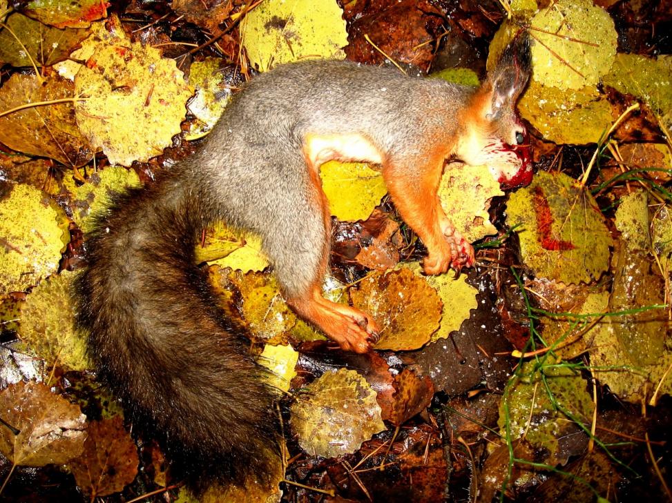 Подхожу, беру рябца, прохожу ещё метра три....БА!!! Оказывается бывают не только шальные пули, но и шальные дробины. Даже такие маленькие как №8 к меня в стволе. Одним выстрелом положил на месте рябчика и белку. Этой невезучке досталось всего две дробинки (как показало вскрытие), одна под мышку и одна в голову.