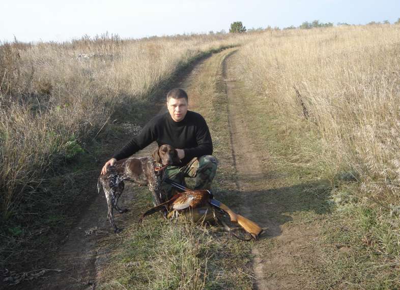 Вот и пришла долгожданная суббота. Еще за темно заехал к другу и в путь - за фазаном. Приехали на место часиков в семь, попили кофейку и пошли не спеша охотиться. Первые крики фазанов добавили адреналина в кровь. Собачка что то причуяв пошла в посадку. Мы насторожившись шли вдоль деревьев, каждого мучала одна и та же мысль - что же там? И вот - захлопали крылья и из деревьев вылетает ПЕТУХ. Я вскинул ружье - Бах.Промазал. Бах. Вторым выстрелом фазан был сражен. В один миг упавший в траву трофей подхватила собака и принесла мне. "Спасибо дорогая, С Полем!".