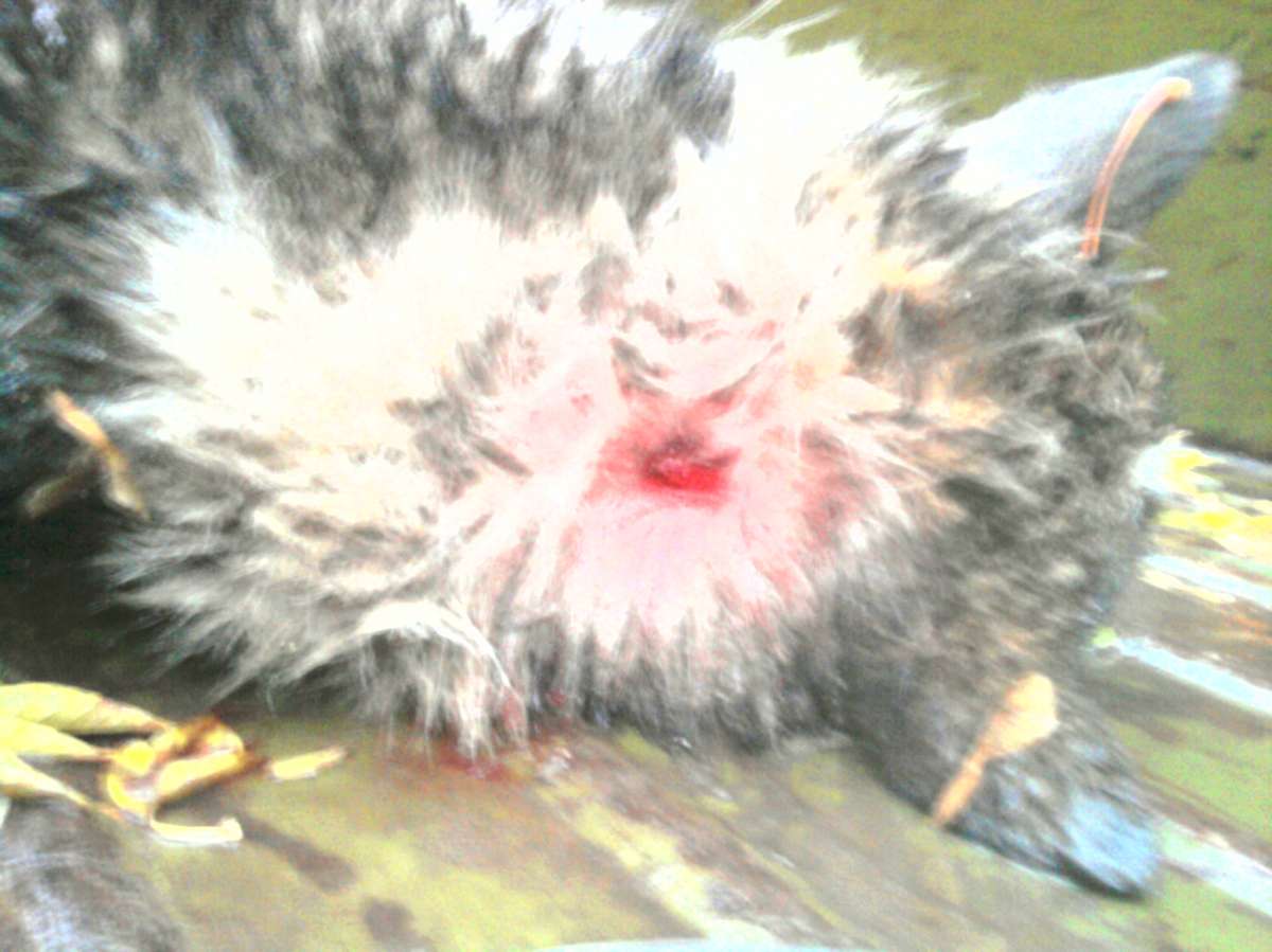 Не, мужики, что хошь думайте, а это выходное от выстрела.Надо идти до конца.Снимать шкуру и вскрывать. Я так делал, когда давным давно мою первую ЛВС собачий киллер зарезал. Ни одной ранки не видно было, пока шкуру не снял. Только тогда малюсенькую дырочку в боку нашёл. А печень вся разорвана была.