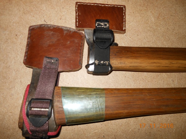 чехлы на всех кожа 4мм, снимаются быстро и удобно, снятый чехол можно надеть на запьястье на манер часов-страховка от потери. Длинна топорища на 2-ом и 3-ем по длине рюкзака.