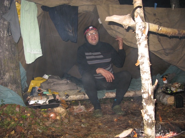 IMG_2500.jpgВача речка и осина,чтоб переночевать.Вверх против течения на веслах,на хатанге,снег с дождем.Осина горит жарко и не искрит,дым правда ядовитый.Ночевать будем под пологом...