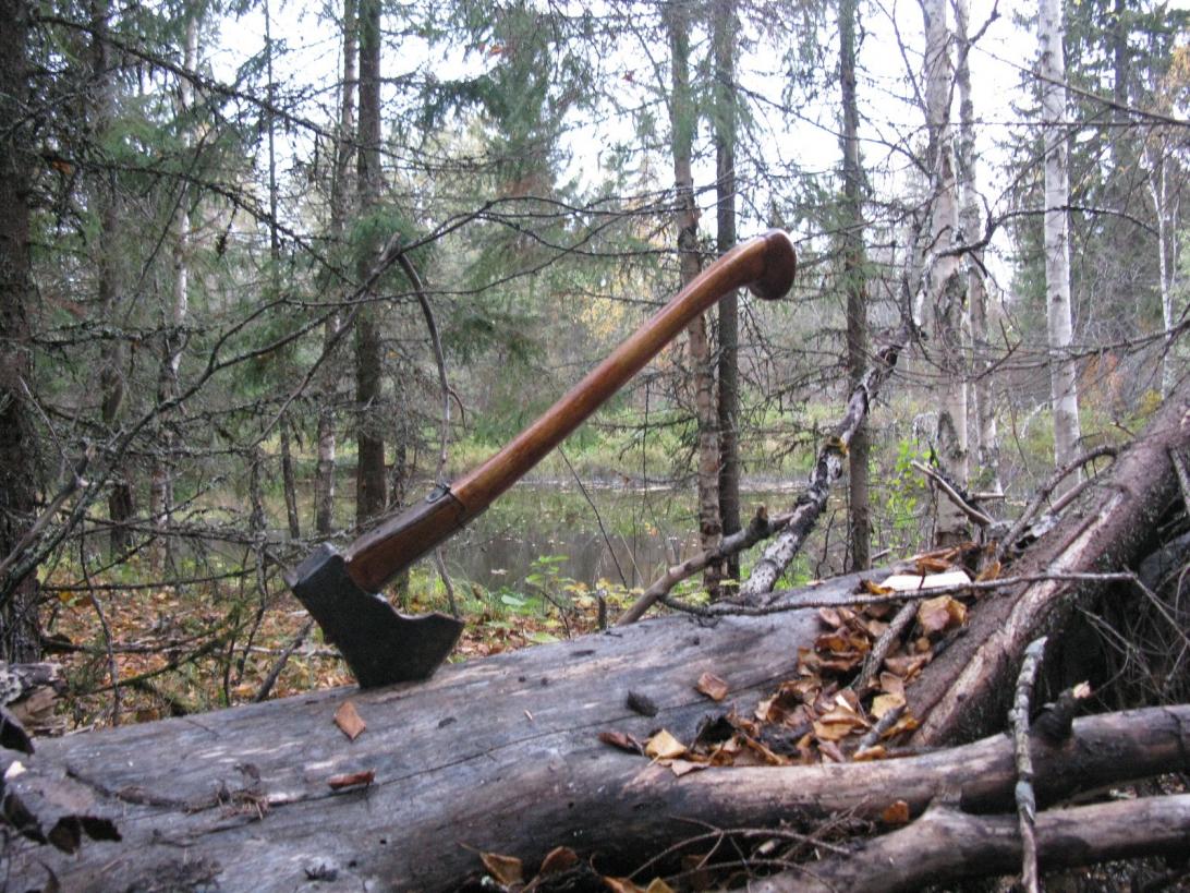 Дом у меня в Тарногском районе Вологодской.Помог родственнице баню наладить-жгло ее излучение инфракрасное.Узнала что топоры делаю-накидала из сарая шесть штук советских.В Москве затарится-толкучка в Новоподрезкове-Питерское направление.Суббота-воскресенье.Смотрю что делаете,блин-защиту советуют наварить-респект.Меня клевали за железки, ветер переменился?Про Вачу спрашивали.Да делаем и ходим с ними-попадется хороший-песня.Да и вообще в переделке просто все....но простое не катит-говорить будет не о чем.Вача на охоте-тонкораскованный-было написано на ярлыке,ручка американский орех,лагерный топор.Второй-вача старый,вымянял на охоте у местного-он слетал постоянно,нельзя с таким в лес ходить.После переделки-выпросил коллега охотник,ручка орех,хотя фиолетово из чего.В ручке красивая текстура полезла,делал для себя,но человеку понравился-отдал и не жа IMG_3644.jpgлею.Топор Вача олень в избе на базе брата,рукоять излишне толстая,но так просил.IMG_3382.jpgIMG_3188.jpgIMG_3218.jpgКлассный вопрос-зачем на охоте валочник.Охотничий топор-валочник хитрый,легкий и производительный.Разные бывают ,правда.Не я придумал.Лагерь балаганный,середина октября,на границе Архангельской.Топор,чтоб нормально в лесу жить.Топор-это ручка на 80 процентов.Имхо.И если она излишне толстая,или крестьянская(так получилось)глаза режет.Хоть убейте.Да хоть из губы,хоть из американского ореха.Хоть прямая,хоть хитро изогнутая.Доводка ручки самая благодарная работа.И не делают.Почему,напишите.........человек которому вачу отдал завален шведскими топорами,говорит этот лучший в коллекции-делался под себя,и мы с ним похожи фигурами,шведские- просто хорошее хозяйственное качество.Поделка.Писал тут про доводку хусварны-из магазина дубье-дубьем.И пропитка маслом сдалась при испытании-за месяц сплыла,ручка -как из помойки топор.Из Швеции топор привезут.....друзья....да их тут полно-оглянитесь просто.Сделать топор-8 рабочих часов,растянутых на неделю,по технологии.176страницапротопор.