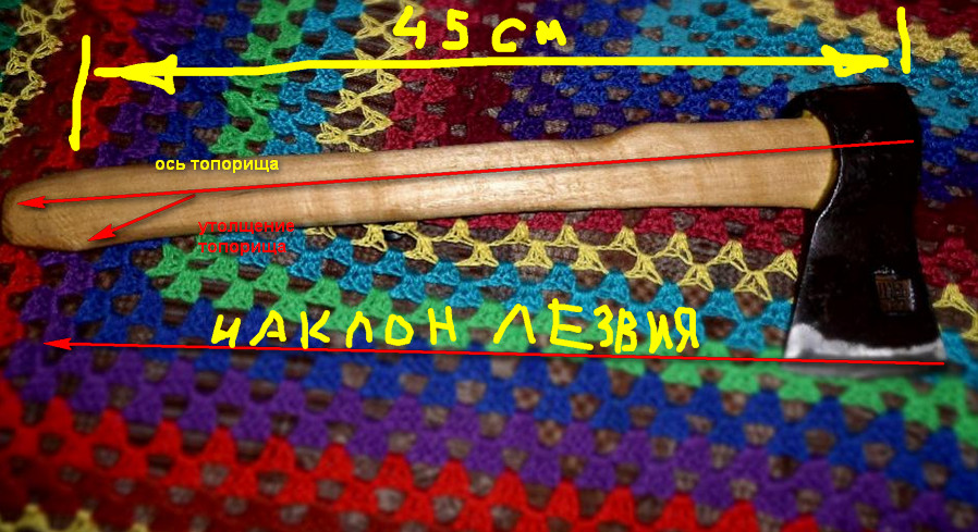 это ясен пень не валочный и не универсальный топор, я пытался сделать его максимально удобным для своих условий работы. универсальное топорище должно быть примерно на 20 см длиннее, но всё равно начинать расширяться должно на расстоянии, равном от середины ладони до локтевого сгиба - у меня это как раз и есть 45 см