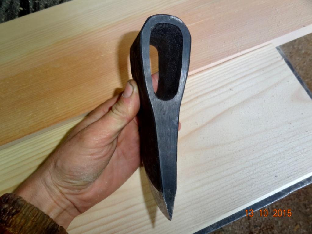 Внутренность проушины клиновидная , разница по ширине (между входом и выходом ) 2 -3 мм , по высоте 4-5 мм . Рукоять капитально просушивается и засаживается на 3 клина . Вертикальный , потом разрубается двумя горизонтальнми . Пропитывается маслом для дерева . Рукояти потом стоят годами и не шевелятся .