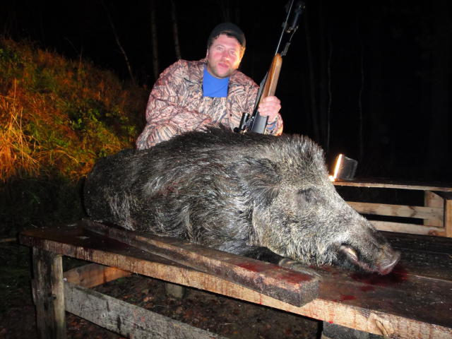 День выдался нам очень удачным, с утра мы поохотились на утку, после чего сделали звонок знакомому егерю и спросили можно ли к нему приехать и есть ли смысл, он нам сказал что есть, к 18.00 мы были уже у него, а через 30 мин мы сидели на 3 вышках, сидели не долго где то через 1.30 прозвучало не сколько выстрелов со стороны одного из наших друзей произошло несколько выстрелов и тишина, посе чего мимо нас пролете егерь на уазике, связавшись с по телефону он сказал что взяли и очень хорошего. по приезду на базу мы увидели достойный трофей, после чего разделка, поздравления стрелка ну и все остальное, вот так прошел наш день охоты, кстати утки мы тоже чуть чуть постреляли.