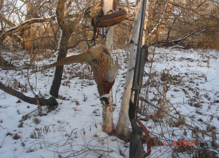 Пока мы с отцом пили чай и кушали, матушка ощипала петуха и к всеобщему удивлению, кроме как перебитого крыла в фазане не было больше ни одного попадания! Т.е. подранок чистой воды! Но тем не менее он был мертвый, когда мы его нашли! Второго петушка уже мне посчастливилось добыть, но то, что я в него попал мне показалось удачей. Уже вечерело потихой…возвращались мы уже вдоль лесополосы к машине, думая, что охота уже закончилась…но тут что-то подтолкнуло меня зайти в глубь леса…не успел я сделать и 5-7 шагов как в метрах 20 взлетает фазан! Лететь ему не совсем удобно из-за деревьев, но и мне стрелять тоже. Вскидываю ружье и понимаю, что все пройденные за сегодня километры с ружьем на изготовку не прошли бесследно – ствол прыгает вверх-вниз, усталость в руках, и я никак не могу поймать петуха на мушку! Тут еще эти деревья! Блин! Но все же удается сделать выстрел и фазан, кувыркаясь, падает на землю! УРА!!! ))) подхожу, поднимаю…здоровый красавец! Так, думаю, надо фотку сделать пока солнце совсем не село. Примастрячил патронташ на березку, подцепил трофей на подвеску, ружье рядом и есть доказательство удачи!