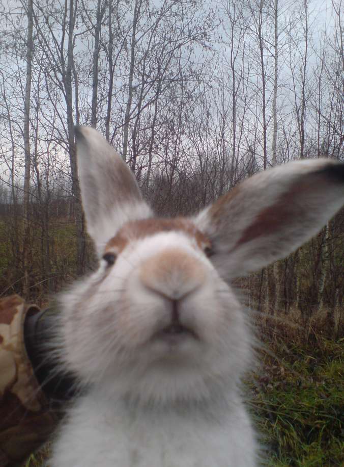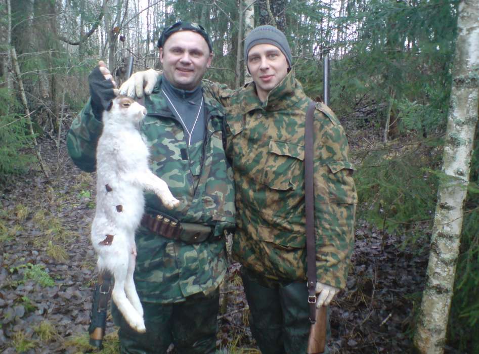 Наконец собрались съездить по чернотропу на зайчика. Итак, контрольный звонок накануне выходных – едем! Подобралась команда в четыре человека, плюс гончак, хоть и молодой, но гончак, ну всё, все зайцы наши! Утром, при сборе команды выясняется - едем втроём, я Саня (Хищник) и наш общий приятель Юра, четвёртого с собакой не будет. Несмотря на изменившийся состав, настроение боевое и уверенность в успехе манит нас в лес. Добрались до угодий. На месте провели рекогносцировку, выбрали подходящий, по нашему мнению лесок и, определив план действий, выдвинулись на позицию. Ну, тут как говориться: «Разделяй и властвуй». Так как Гончака с нами не было решили проводить загон с засадой. Меня отправили в засаду. Обойдя загон стороной, я вышел на предполагаемое место выхода загонного зайца. Саня с Юрой выдвинулись в лес. Почти сразу Саня сообщил по рации: «Зайца столкнули, лови!». Стою тихонько в засаде, на номере, загонная ведь охота. Через некоторое время подходят загонщики – заяц ушёл в сторону, у лосей видать научился. Небольшое совещание, намечаем маршрут для нового загона, я опять на номер. Второй загон – итог тот же. Заяц хитрюга попался! Мы не расстраиваемся, нас это лишь подстёгивает – идём в третий загон. Косой опять смылся! Меняем тактику – идём в загон все трое широким фронтом. Хитрый заяц снова от нас ускользает! Мы решаем взять его измором – опять загон, но, опять меняем траекторию загона. Заяц хоть и хитрый, но не может он просчитать упорных охотников, постоянно меняющих тактику. Четвёртый загон – от меня жар идёт как от беговой лошади. Молодёжь, Юра, вырывается вперёд, а я из последних сил, не гоняя ведь я, работаю в загоне, слегка отстав от коллег. И тут смотрю метрах в двадцати пяти от меня в глубине леса, благо полянка случилась, мимо летит белый заяц! От неожиданности или от большого ожидания его увидеть я как то вдруг растерялся – на мгновение заворожил меня его бег. Тут мысль в голове: «Чего стоим, кого ждём? Стреляй, уйдёт косой то!». А он, гад шпарит галопом! Вскидываюсь – выстрел и он падает как подкошенный! Я не верю своим глазам, держу его на мушке, вдруг он змей притворился и рванёт сейчас, стоит мне пошевелится. Но, смотрю, бежать ему не хочется, и я бегу к нему. Позабыв про рацию, кричу ребятам: «Есть, я его взял!!!». Моей радости нет предела, от эмоций аж потряхивает. Мой первый заяц! Не большая фотосессия с трофеем - я свечусь как «Лампочка Ильича». Странно, не думал, что будет такой выброс адреналина. Куда-то улетучилась усталость от четырёх загонов. Идём к машине. Отметив удачу, коллеги по оружию коньячком, я чаем – за рулём не пью, перекусив и отдохнув, идём обследовать другой, на наш взгляд, перспективный лесок. Лесок оказался раза в два больше. Прочесав его вдоль и поперёк, зайца не обнаружили, подняли лося, но не на него загон, так что пусть до лучших времён погуляет. Время уже к вечеру, охота закончена, мы вконец обессиленные, но счастливые направляемся к машине. Перекусив на дорожку и ещё раз, отметив удачную охоту, выдвигаемся домой.
