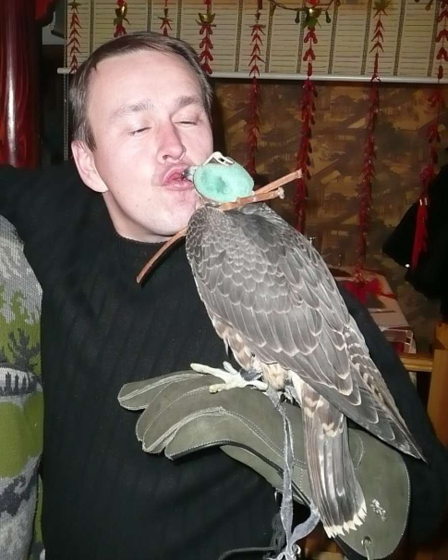 Прибежал с работы Влад со своей напарницей-соколихой и сразу стал центром внимания окружающих!Все хотели посмотреть и сфотографироваться с ней!