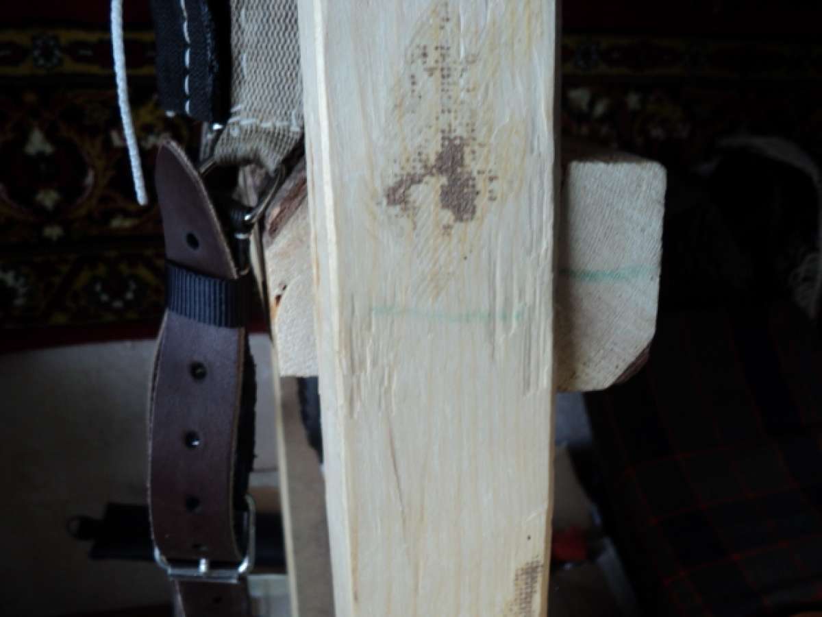 Вес человека приходится на середину лыжи, если лыжа изогнута, то вес охотника распределяется более менее на всю лыжу, особенно это заметно когда идёшь по сухим веткам, меньше ломаются под лыжей. На крутых подъёмах по рыхлому снегу тоже идти легче, под лыжей образуется как бы горка, которая помогает камусу удержатся на крутом подъёме. Даже если идёшь по ровному, задник лыжи без загиба, немного поднимается над лыжнецей, и немного хлопает, когда опять опираешься на лыжу, лыжи с изгибом, практически не отрываются от лыжницы, поэтому создают меньше шума при ходьбе. В правилку лыжи зажимаю не только для того чтобы сохранить изгиб в середине лыжи, и загиб носков лыжи, но и для того чтобы их не повело винтом, что самое страшное, ходить на таких лыжах очень неудобно,даже если винт не значительный и на глаз не видно.
