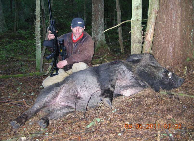 Это когда мы с егерями езим ночью по полям и смотрим, где вышли кабаны. А дальше - все очень легко: охотнику нужно незаметненько подойти по чистому полю к кормящемуся злобному вепрю килограм под 150, или табуну голов в 50 на расстояние уверенного выстрела (для гладкого ствола - 30-40 метров) и произвести этот самый выстрел. Если ранил, то, подождав чуток и поменяв памперсы - добрать.