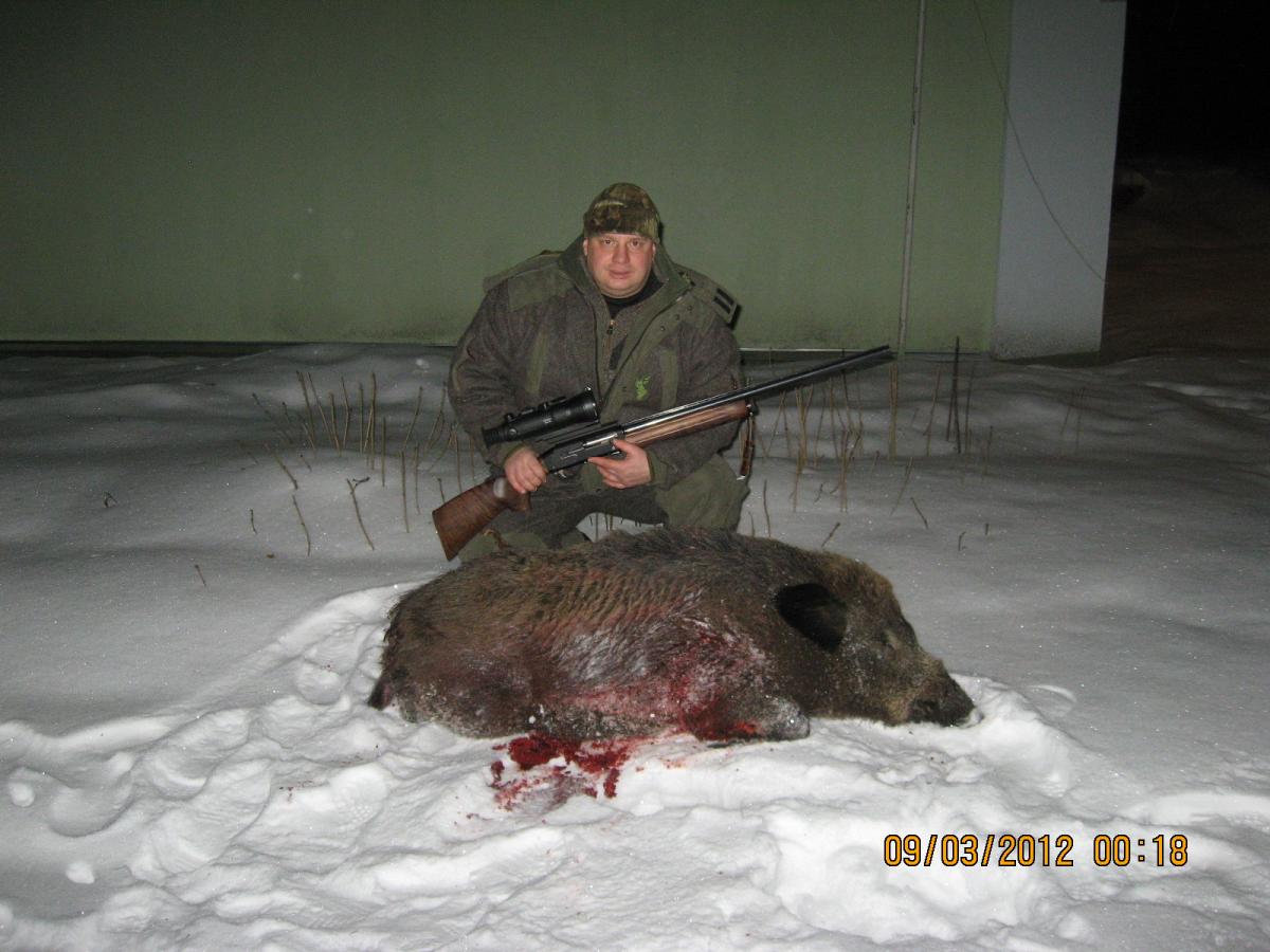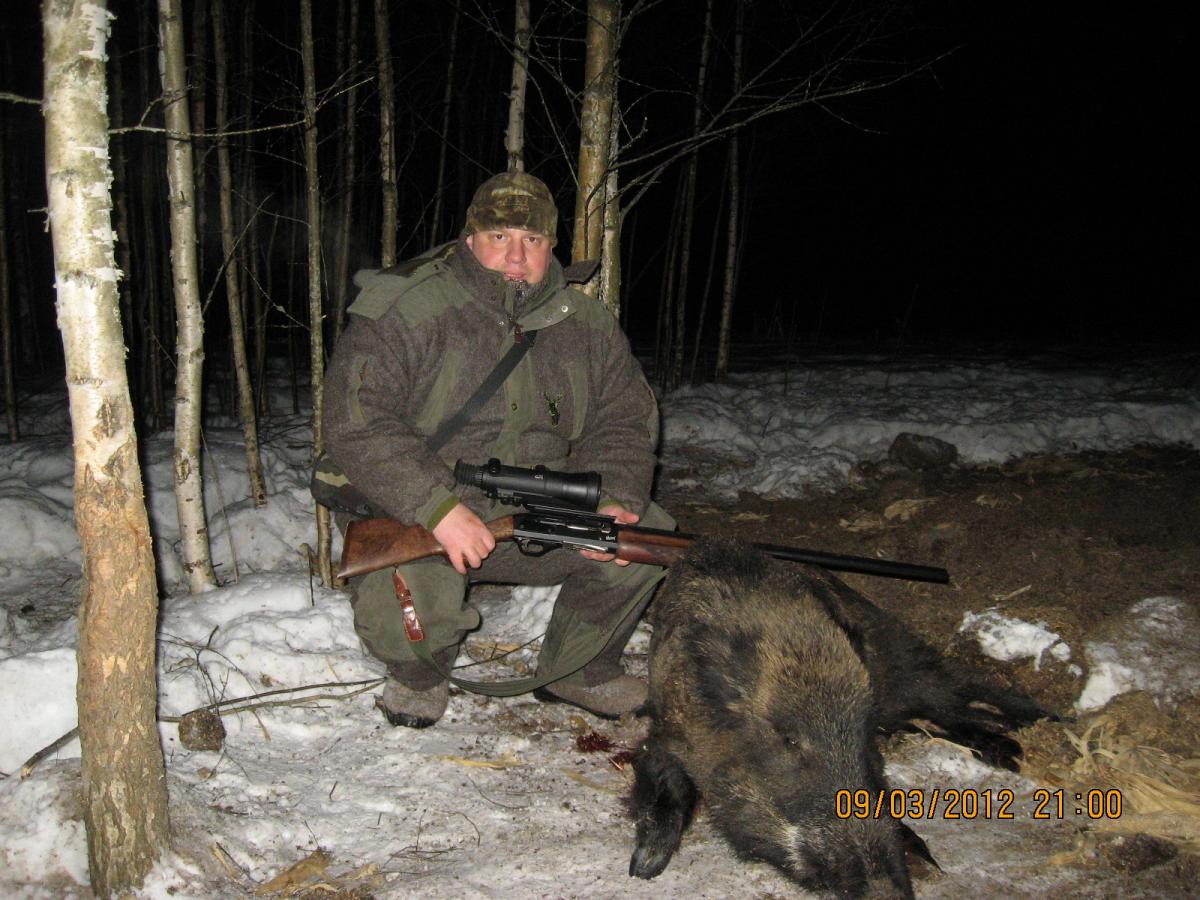 На следующий день был запланирован выезд на дальнюю вышку, где с их слов, они не охотились месяца три, только иногда, прикармливали. Ехали часа два, сначала на машине потом на снегоходе. Егеря сказали, выйдут засветло. В 18 часов были на месте. Начало смеркаться и в 20.30 послышался шум и треск- кабаны приближались, немного побесились в кустарнике, не таясь и не прислушиваясь вышли прямо к площадке (егеря были правы, тут давно не охотились и кабаны чувствовали себя вольготно). Вышло два кабана, приблизительно такие по размерам, как и прошлой ночью. От егеря получил добро, прицелился - выстрел , кабан упал на бок, перевернулся на спину, потом на другой бок , дернулся и затих. При разделке егеря сказали,-« попал точно в сердце, его разнесло просто и пуля застряла в нем, поэтому сразу и умер». Привязав к снегоходу, направились к дороге. Кабана определили весом в 130 кг.
