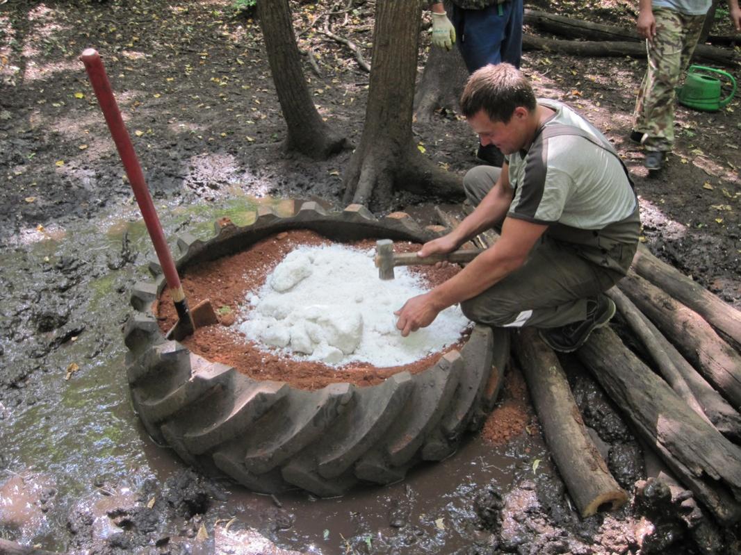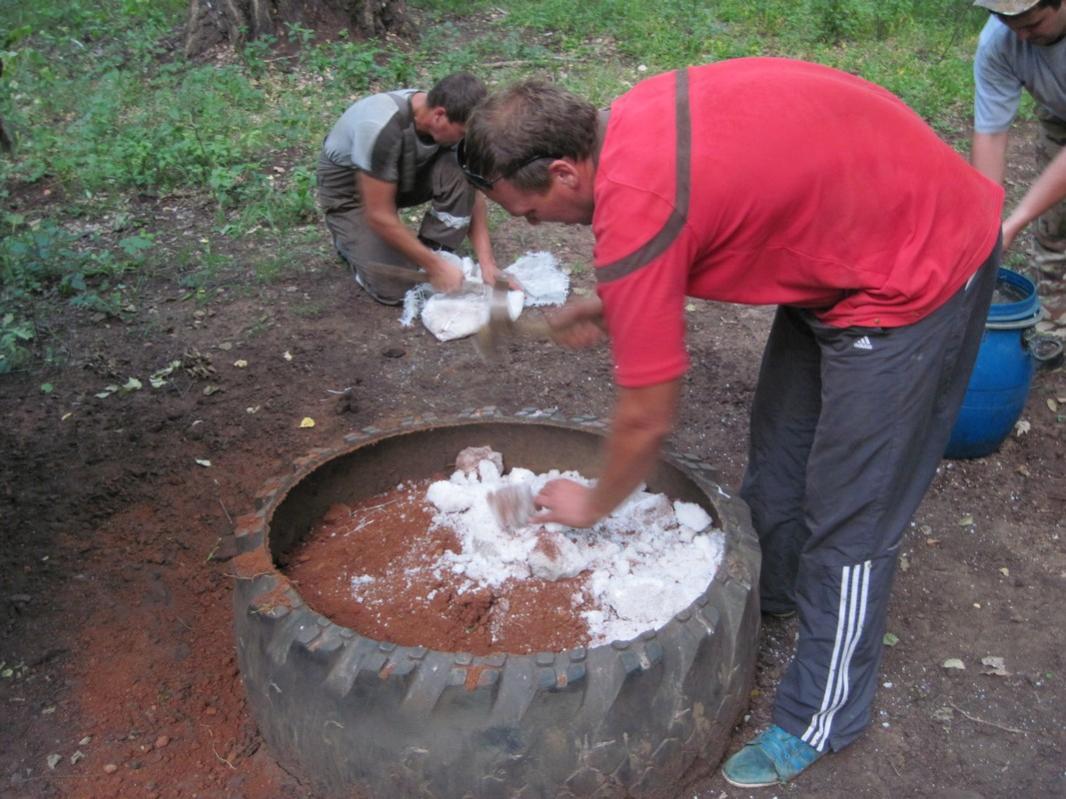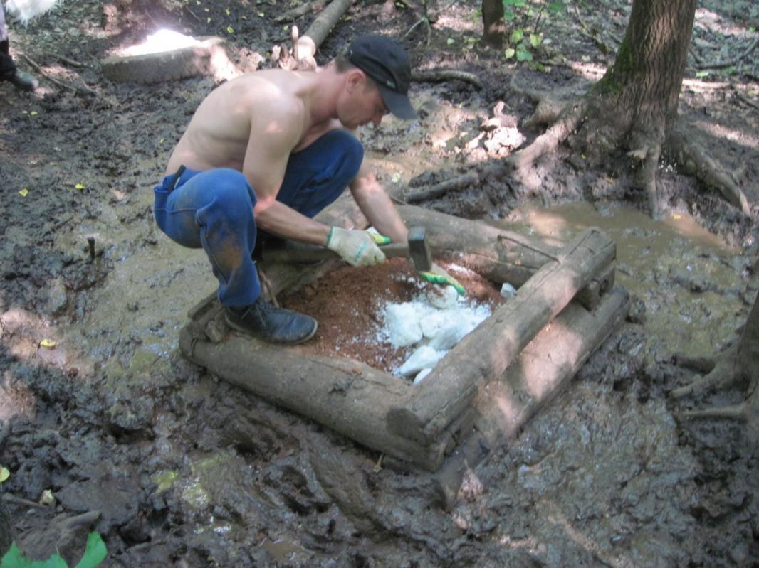 загружаем глину с солью, размешиваем лопатами (соль долго ждала своего часа, поэтому её приходится дробить молотком и лопатой)