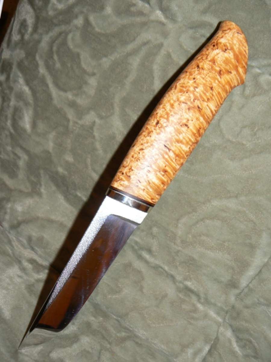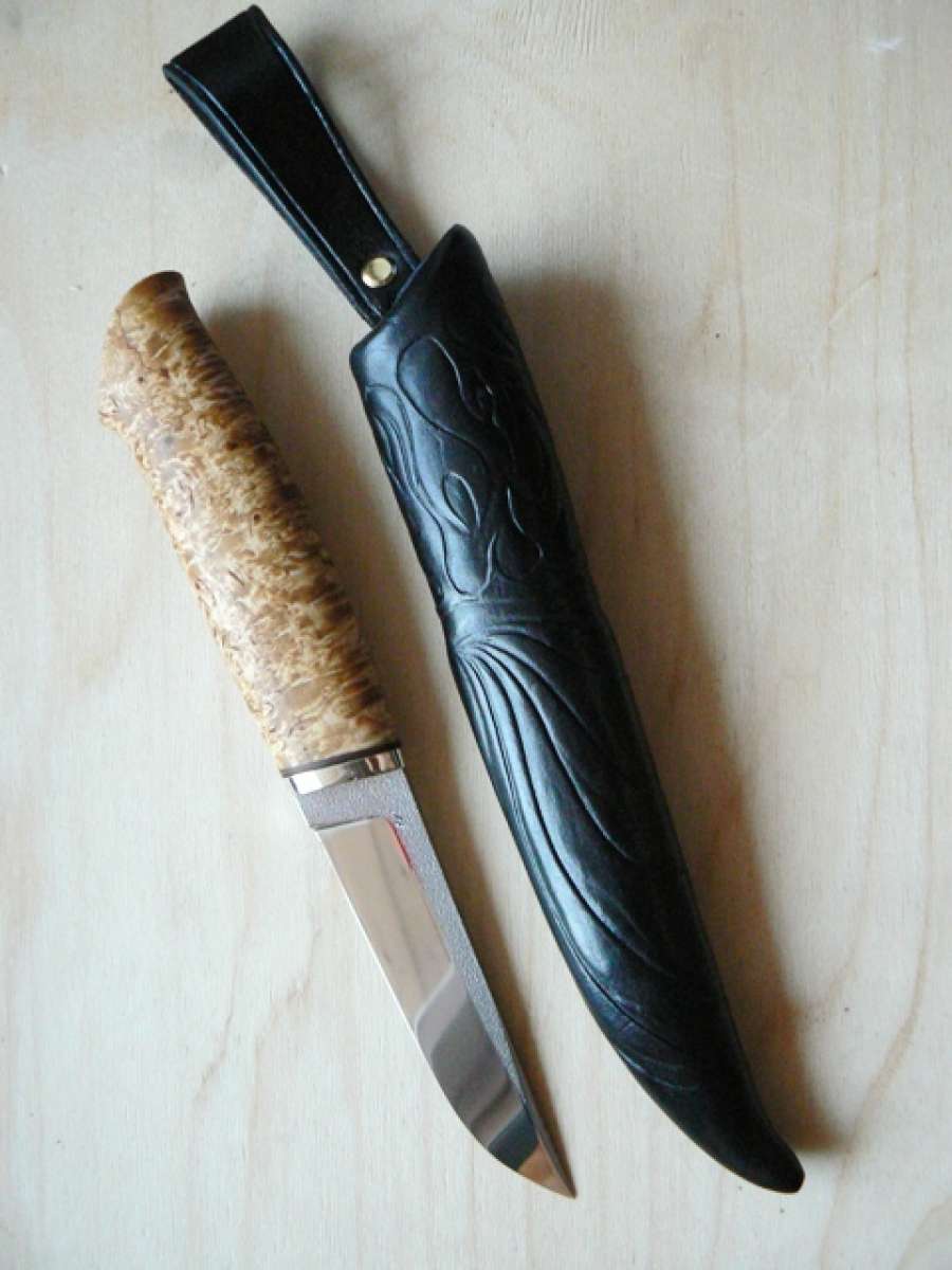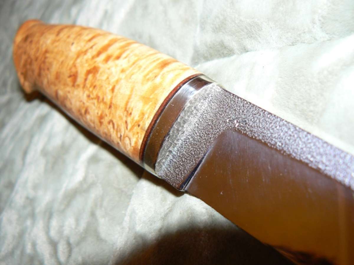 Рукоять карелка 125 мм, больстер мельхиор 5 мм, проставка оленья кожа, тонирована спиртовой морилкой из чаги