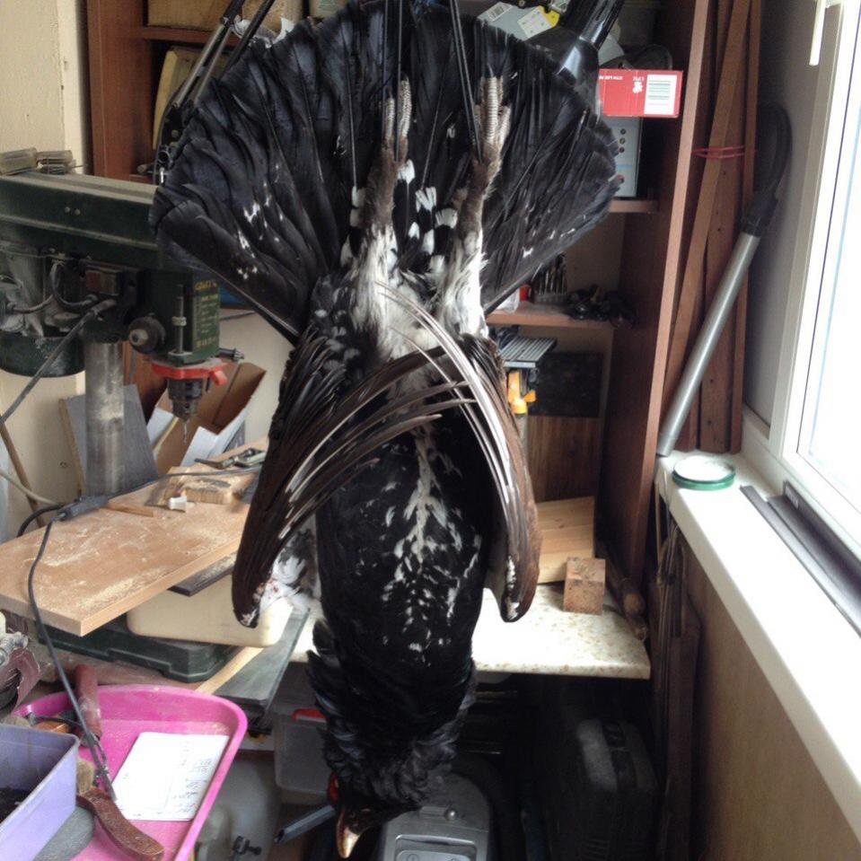 Вчера, посмотрев прогноз погоды на сегодня, рванул на свой ток. Пока шел промок насквозь, ветер в лицо, но в голове держалась надежда, что к ночи обещали звезды и небольшой ветерок. То, что нужно! В идеале штиль конечно. В 4-00 вылез из гамака и начал слушать. Подошел к мошнику, не видя его, но понимая, что он метрах в 15-20 максимум начинаю вглядываться в верхушку сосны. И тут за спиной послышались удары крыльев. Сзади началась драка и мой глухарь слетает на землю в 7(примерно) метрах от меня. Зрелище надо сказать очень впечатляющее, тем более, что вот так я его еще не видел! Я весь обомлел, но дождался когда он начнет петь, бегать и когда отойдет подальше, чтоб не разбить выстрелом. Стрельнул через силу не успев насладиться красотой, потому как почувствовал слабость и еще минута рука не поднялась бы на такую красоту. Глухарь оказался мотерым и сейчас вывешивается у меня на балконе. Всем удачи!