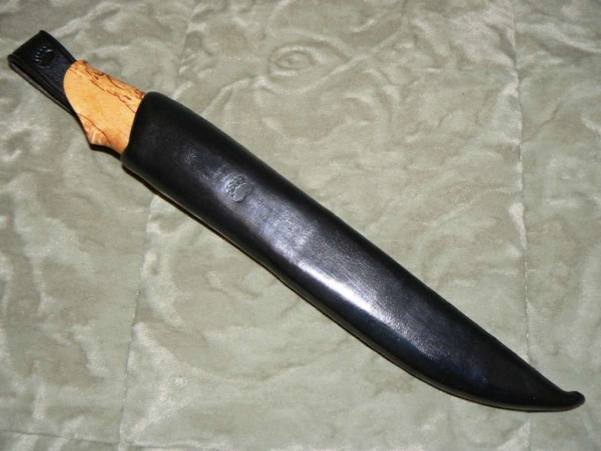 Ножны - кожа желатинированная финская, шов встык заглажен, вкладыш береза, подвес на полукольцо, краска, крем-лак для обуви.