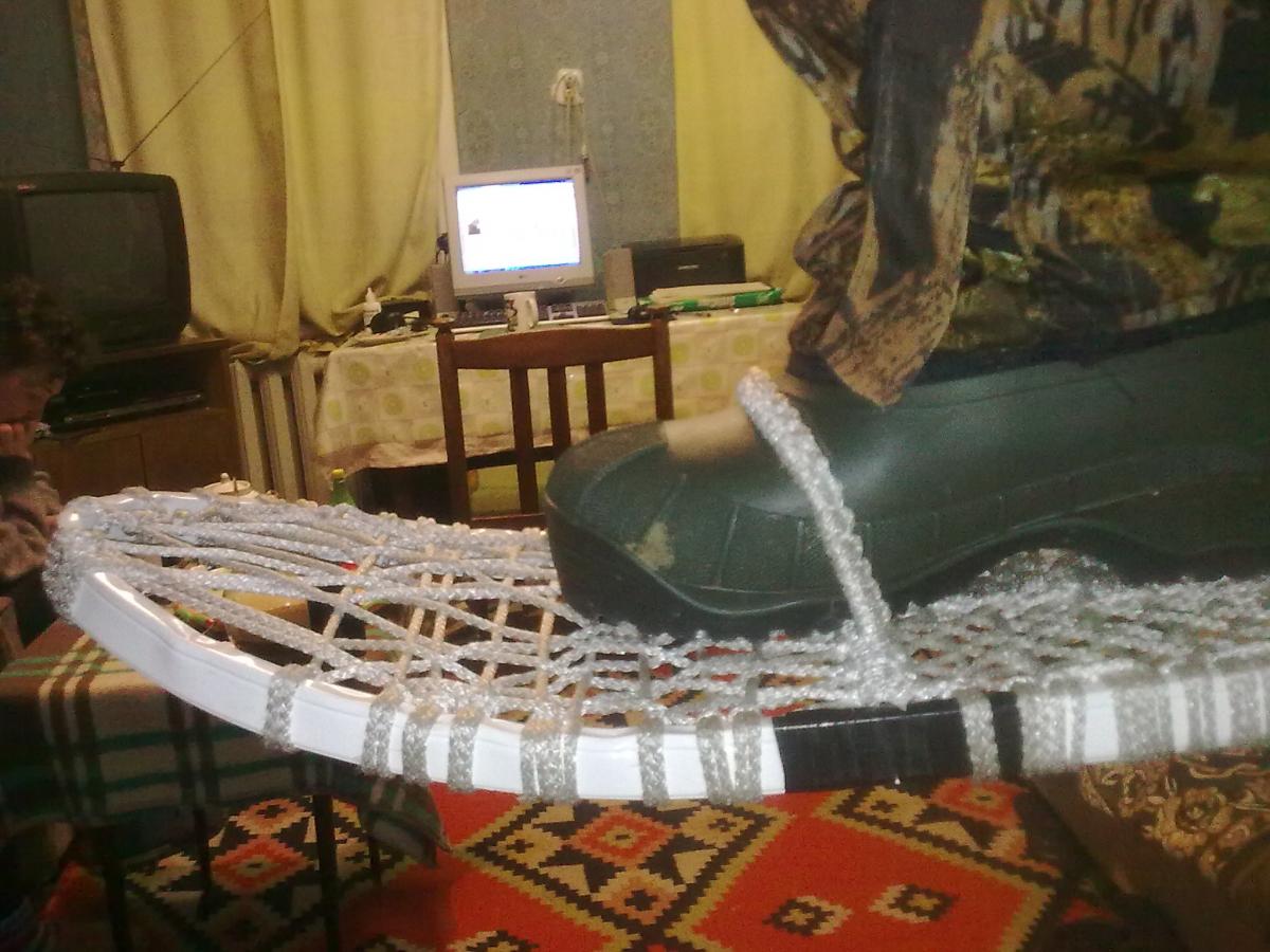 написать как раз и забыл. Хотел, просто из головы вылетело. Каркас алюминиевый, сделан из профиля москитной сетки. У кого стоят дома пластиковые окна тот знает о чём я. Оплетал капроновым шнуром, обычная бельевая верёвка. Продаётся бухтами по 30 метров. На обе лыжи ушло четыре мотка. Поперечины и хвостовики крепил на заклёпки. Заклёпки толщиной 4.5мм. В идеале их бы конечно надо приварить аргоном. Но как то у меня аргонной сварки под рукой не случилось, а куда то ехать и просить, жаба задушила. Решил посадить на заклёпки. Но в принципе сидят прочно. После того как я на них прошёл ничего не разболталось. Всё осталось также как было.