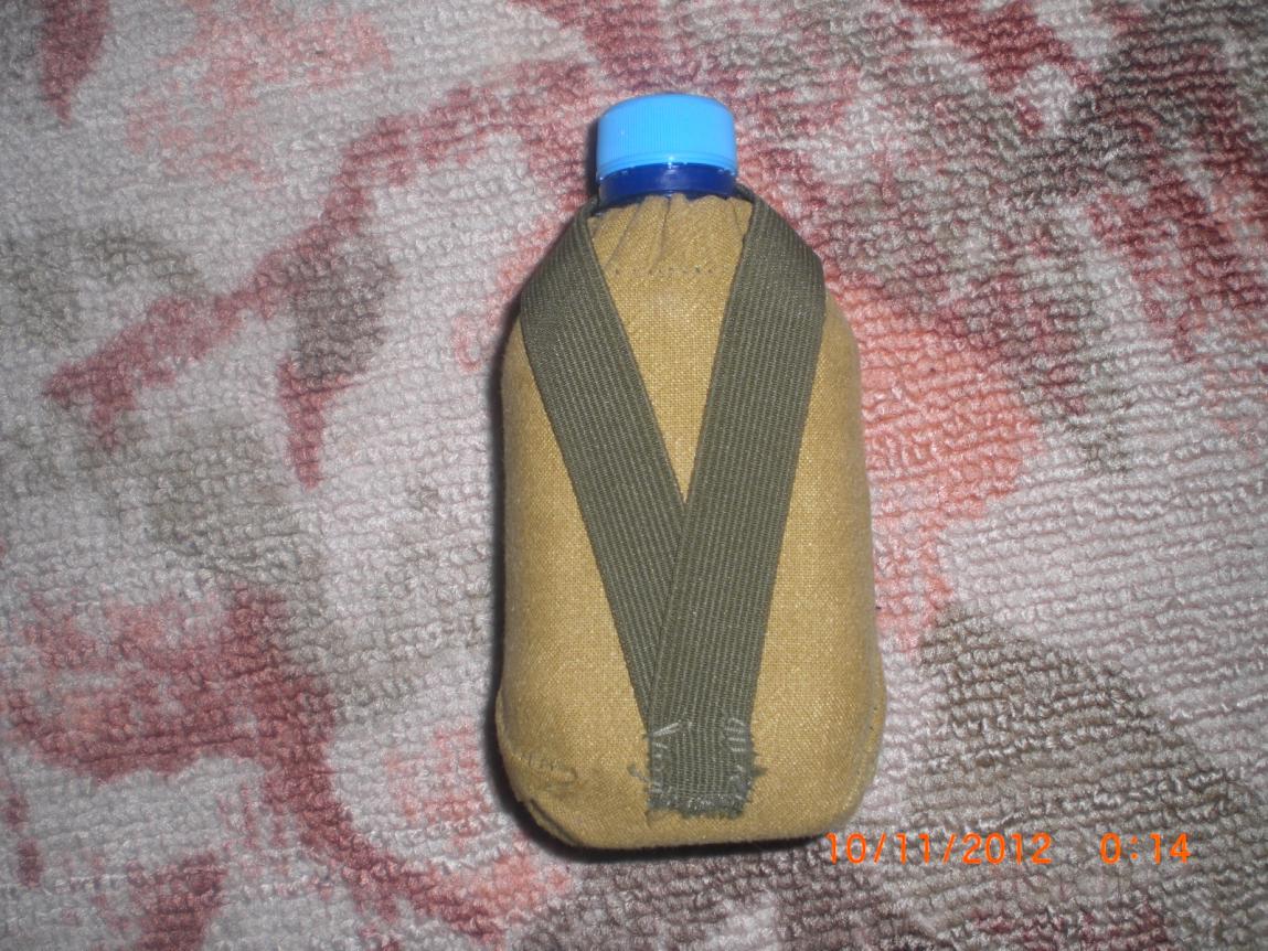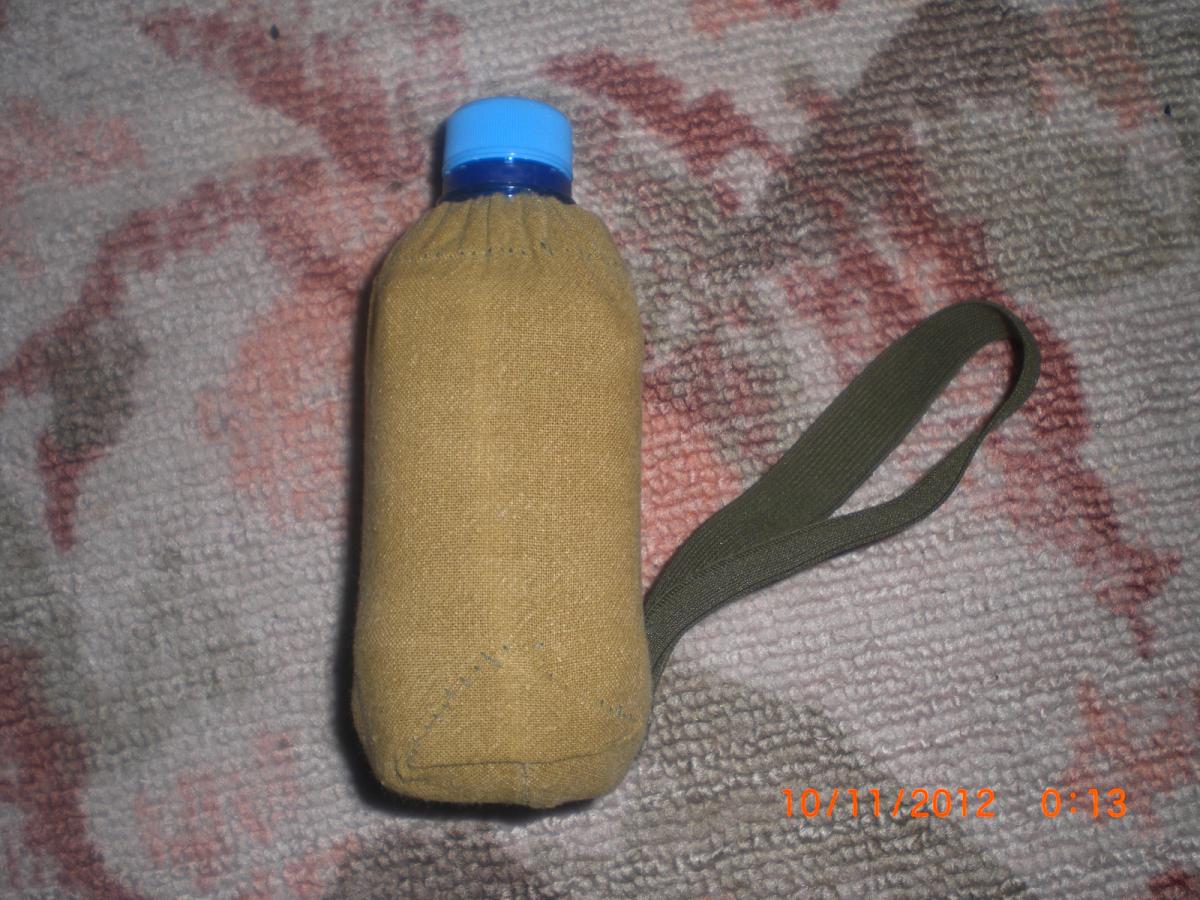 Второе: от ношения армейской алюминиевой фляги на ремне давно отказался - тяжелая, да и столько воды на поясе мне не надо. Очень здорово под флягу мне подошла пластиковая бутылочка от воды "Шишкин лес" - 400 гр. она очень компактна для своего объема. Чехол сшил по образцу чехла на армейской фляге, только нет пуговицы и в качестве лямки использую широкую резинку. Вес фляги она выдерживает, а снимать с ремня гораздо легче.