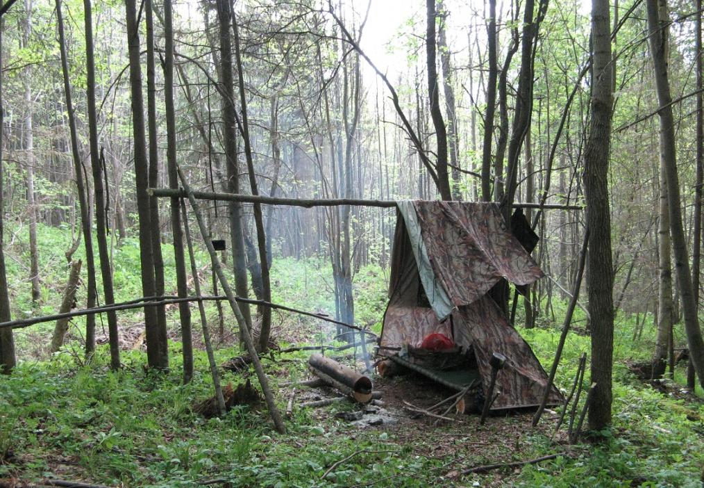 Такой вариант, только без пружин (от пружин отказался, т.к. их всегда можно заменить подручными средствами), я использовал на весенней охоте всего пару раз. А затем сшил новый тент и перешел на более универсальный способ закрепления верхнего бревна, очень удобно вписывающийся в балаган с новым тентом и жердью, проходящей над костром.