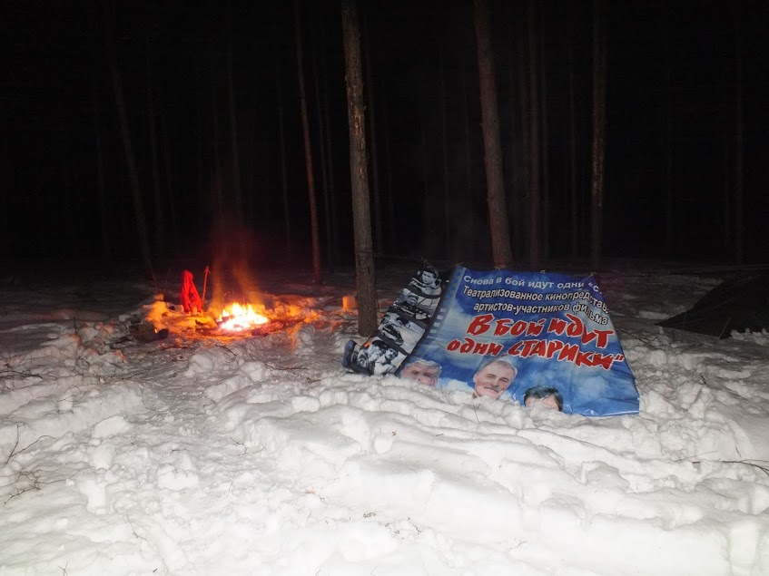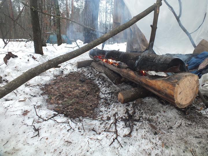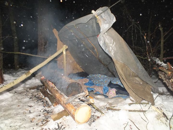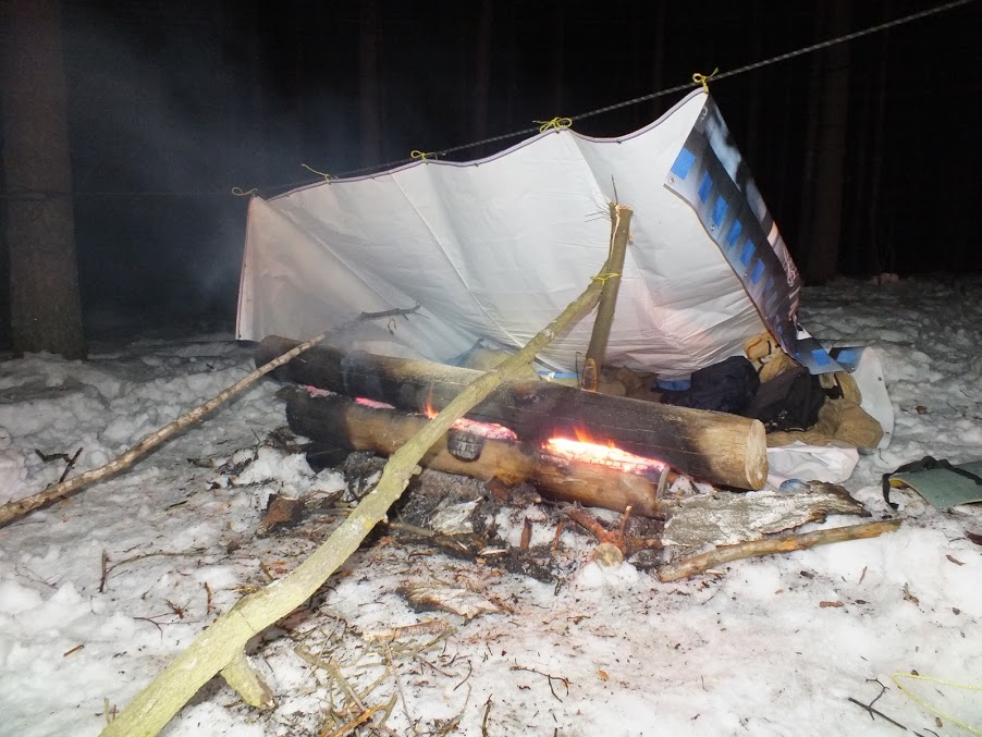 На этот раз балаган был собран выше и комфортнее, из полиэтиленового тента и жердей. Нодья расположена с небольшим отступом от "конька". Такое интересное ощущение, дым от костра при отсутствии ветра поднимается вертикальной ширмой. Промахивание попсером пару раз в ночь, даже во сне несколько раз..