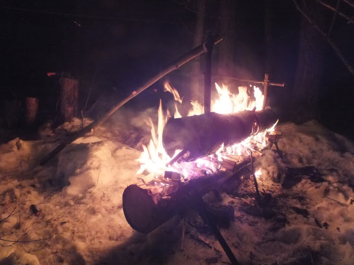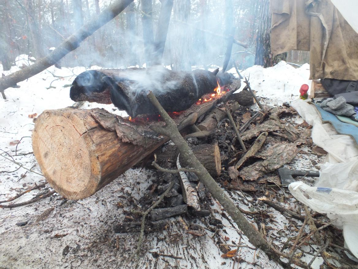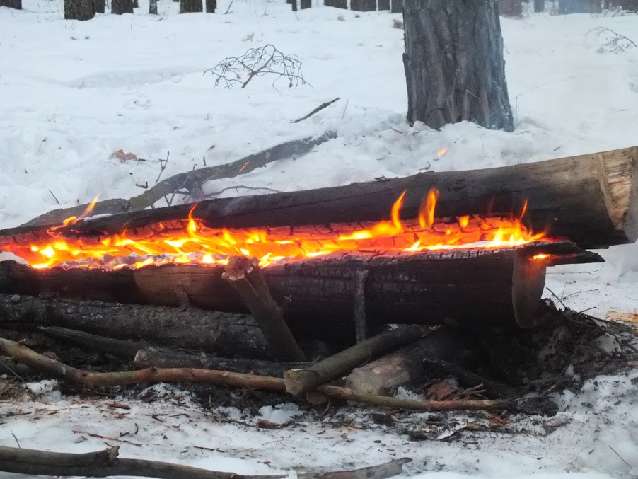 Собственно возникла идея, как эффективнее инициализировать нодью. Что если подготовив бревна, вбив колья и т.п., положить их рядом и разжечь между ним костер с применением например третьего, более тонкого, а по разгоранию, выпив чайку и приготовив ужин, повернуть нижнее и расположить на нем верхнее? Подозреваю, что будут нюансы, но попробовать надо.