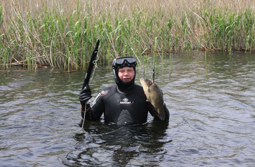 маска протекает ну вобщем как корова на льду я!Все устраняю и начинаю нырять,а меня все пытается перевернуть тело на спину!Вобщем совладав со своим телом начинаю потихоньку плыть возле травы,мое ружье наготове!И тут вижу на меня прет 4 здоровых карася я палю и что на моем гарпуне сидит карась!Плыву дальше через метр еще карасей 6,стреляю есть ну вобщем я потом так обнаглел что начал выбирать самых больших и жирных