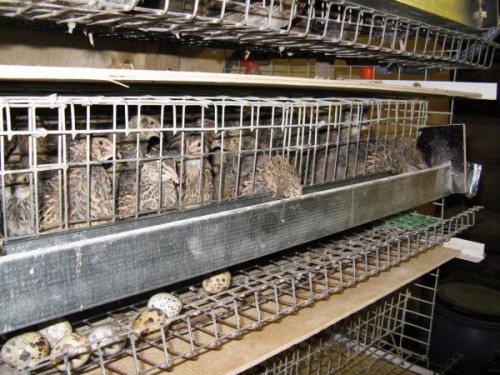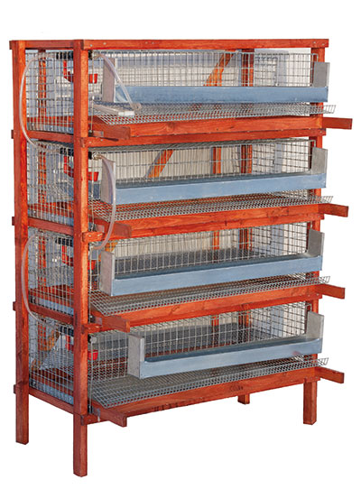Кормушки и поилки, как и лоток для яиц, размещены за пределами клетки, иначе они разгребут корм залезая туда лапами и будут мешать друг другу.