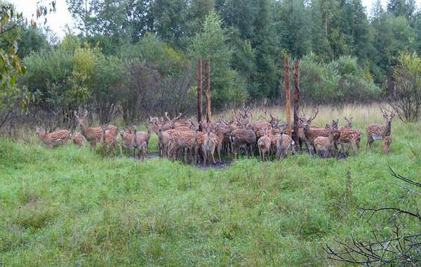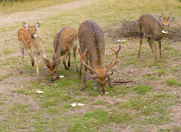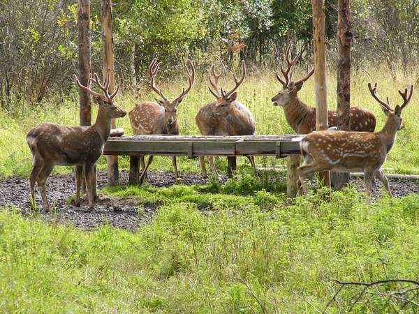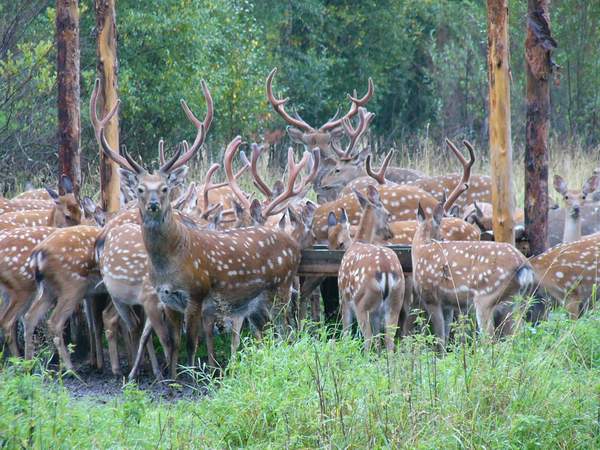 стадо пятнистых оленей с удовольствием ело овес (зерно) причем круглый год,