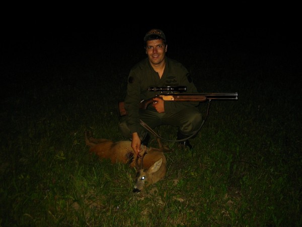Мы приняли решение выезжать в ночь на пятницу и как оказалось это было правильно !Сразу по приезду нас встретил Айнарс , накормил и мы тут же отправились на утреннюю охоту на косулю.Как она проходила у Эрика он напишет Сам, а у меня приключился интересный случай : увидел козла на 250-300 метров и начал подход.Скрадывал скрадывал и когда было уже готовился к выстрелу примерно на ста метрах, он вдруг исчез ,я приподнялся с колена над полем смотрю в сторону предпологаемого его нахождения -нет его, привстаю еще чуть выше , поворачиваю голову налево, а он стоит метрах в 30-40 от меня , видя меня он делает еще два скачка в мою сторону и останавливается.Я стреляю примерно в грюдь ,сквозь траву попадаю , точнее почти отстреливаю переднюю правую ногу. Козел раненый скрывается в лесу. Дальше интереснее, как индеец начинаю искать его по кровяному следу, обследуя каждую травинку,каждый листик ,каждый самтиметр поля...леса ...канавы ..через пол часа я прошел таким способом где то метров 600 , рядом со мной вдруг появилась знакомая лайка Айнарса с GPSом на шее и через 2 минуты пройдя еще метров 150 я дострелил своего козлика. Так закончилось утро нашего первого дня. Вечер первого дня был не такой удачный , я сидел на вышке и караулил кабасика,но кроме самки никого не увидел и домой вернулся пустой. Второй день начался у меня так же , как и закончился первый )) без результатной охотой на кабана, да и вообще я его хотел наверно больше чем косулю стрельнуть, но не срослось. Зато вечер я провел очень продуктивно, охотился с местным крестьянином и другом Айнарса на его полях. Засек хорошего козлика с рогами чуть лучше чем стандартные, начал подход. Дойдя до убойного и комфортного расстояния около ста метров начал его выцеливать.А забыл совсем, поле - пшеничное и от козлика видны только уши да рожки , иногда голова и кусочек спины.Мысленно рисую силуэт животного , целюсь примерно в середину лопатки ,выстрел .....и козлик как стоял так и остался стоять, потом медленно ушел. ПОТОМУ что нехрен стрелять через траву ))Потом минут через 15 на соседнем поле увидели еще козлика , конечно уже не с такими трофейными качествами как этот, но тоже хорошо.Стрелял на 100 метров,козлик упал там же где и стоял.
