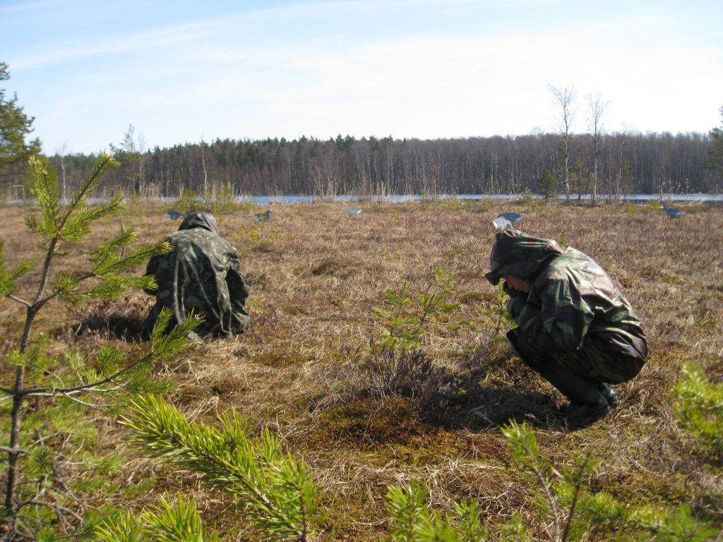 Часть болота примыкает прямо к озеру, далее основная часть большого болота уходит как бы перпендикулярно от озера вдаль. Еще на некотором удалении от озера (откуда сделана фотография) есть кустики, сосенки где легче прятаться. Далее болото абсолютно без растительности. Собственно вопрос - где все-таки лучше выставляться и располагаться в такой ситуации? Могут ли сесть гуси ближе к озеру или если и пойдут, то уже в глухое болото?