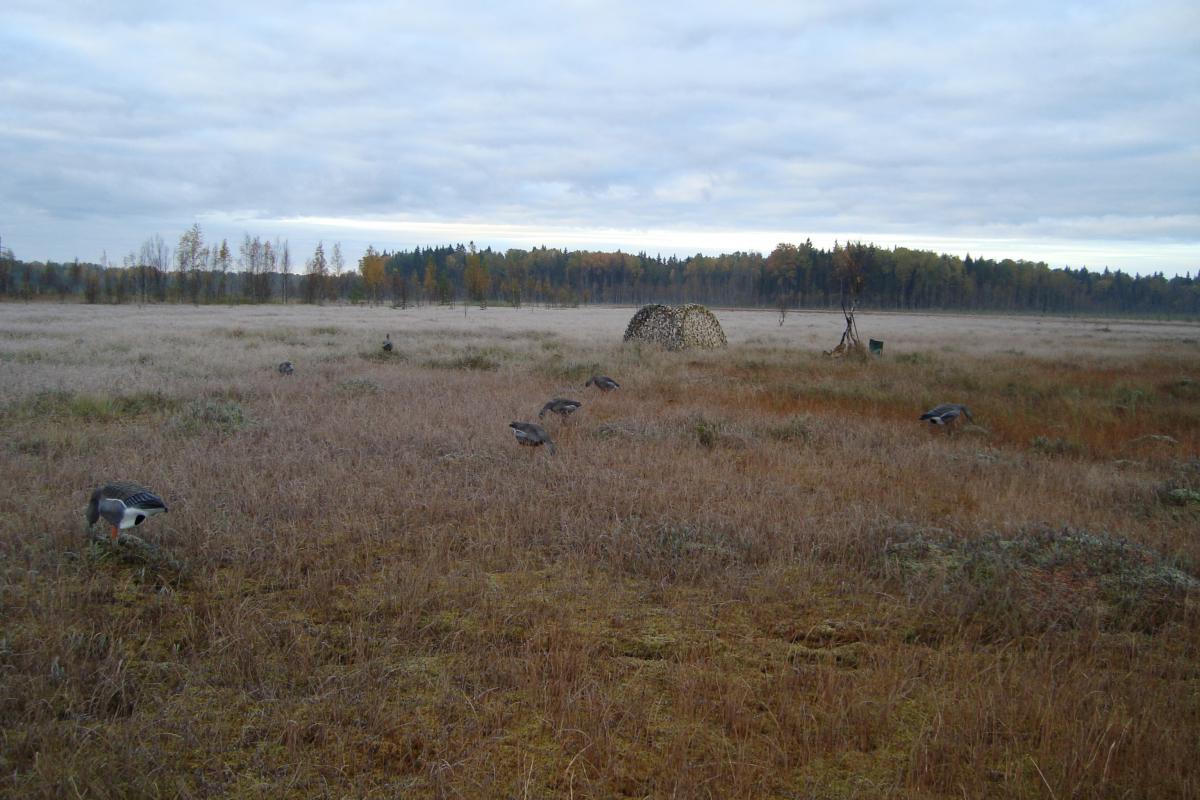Сегодня за день несколько стай, около десятка, в основном низко, рыскающим полётом. На вечёрке только одна стая, наманить не удалось. Сели на болото, метрах в 500 от нас.