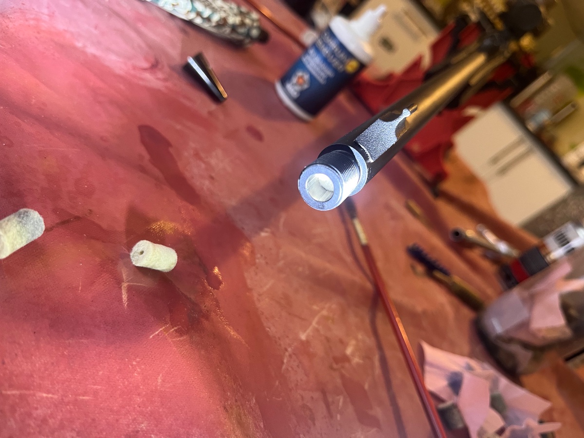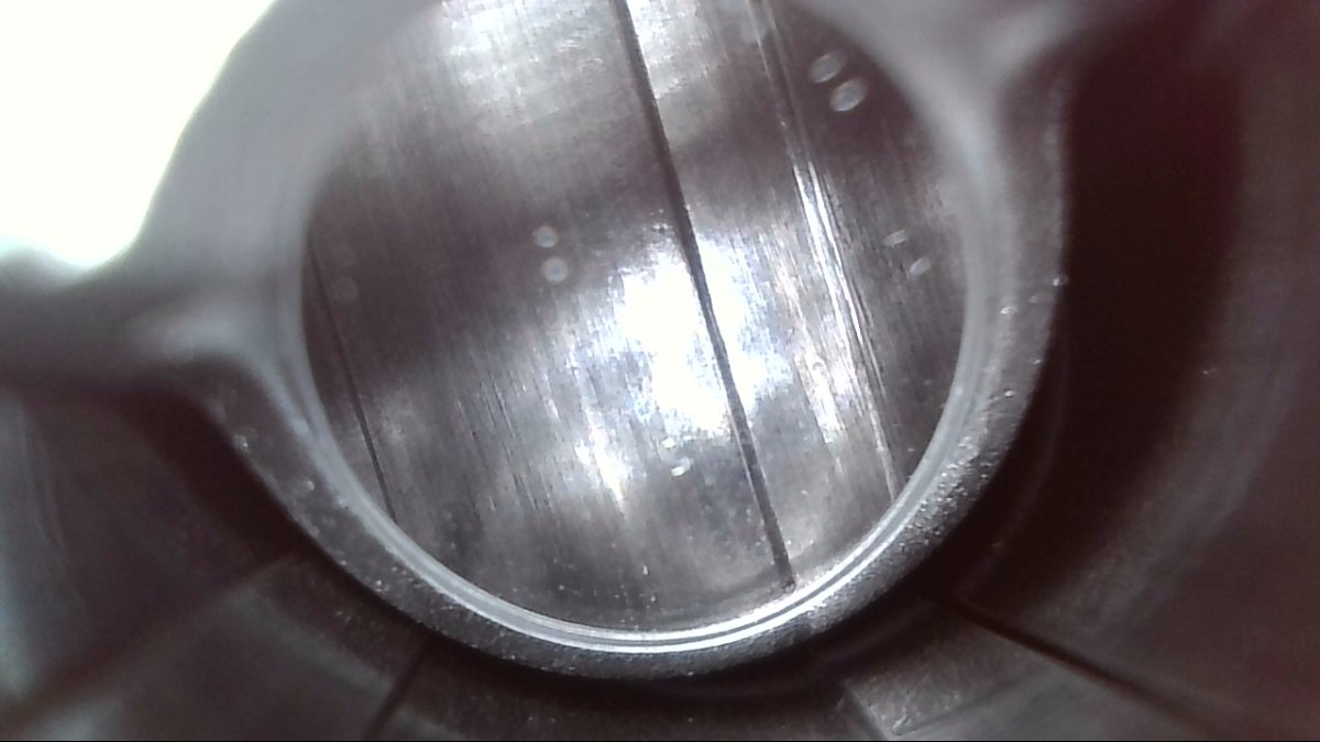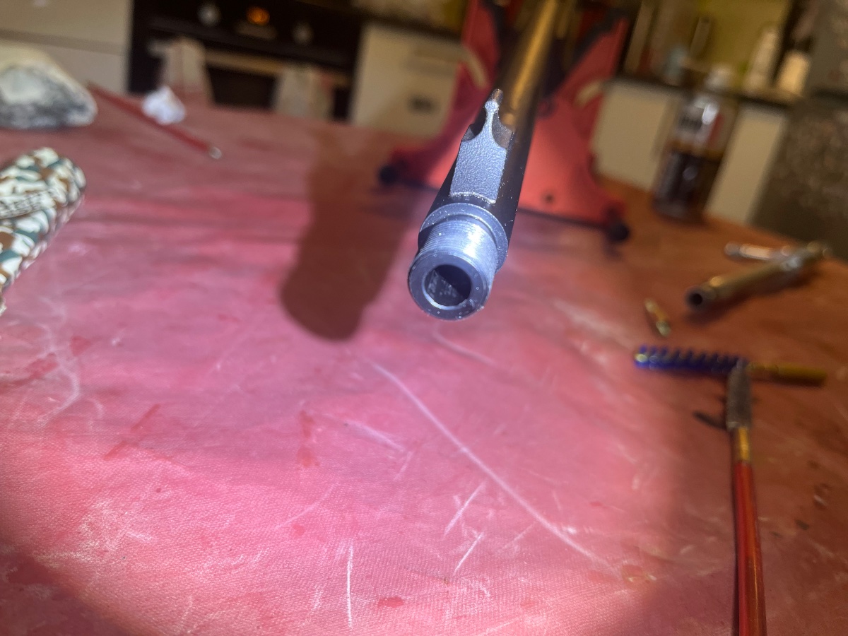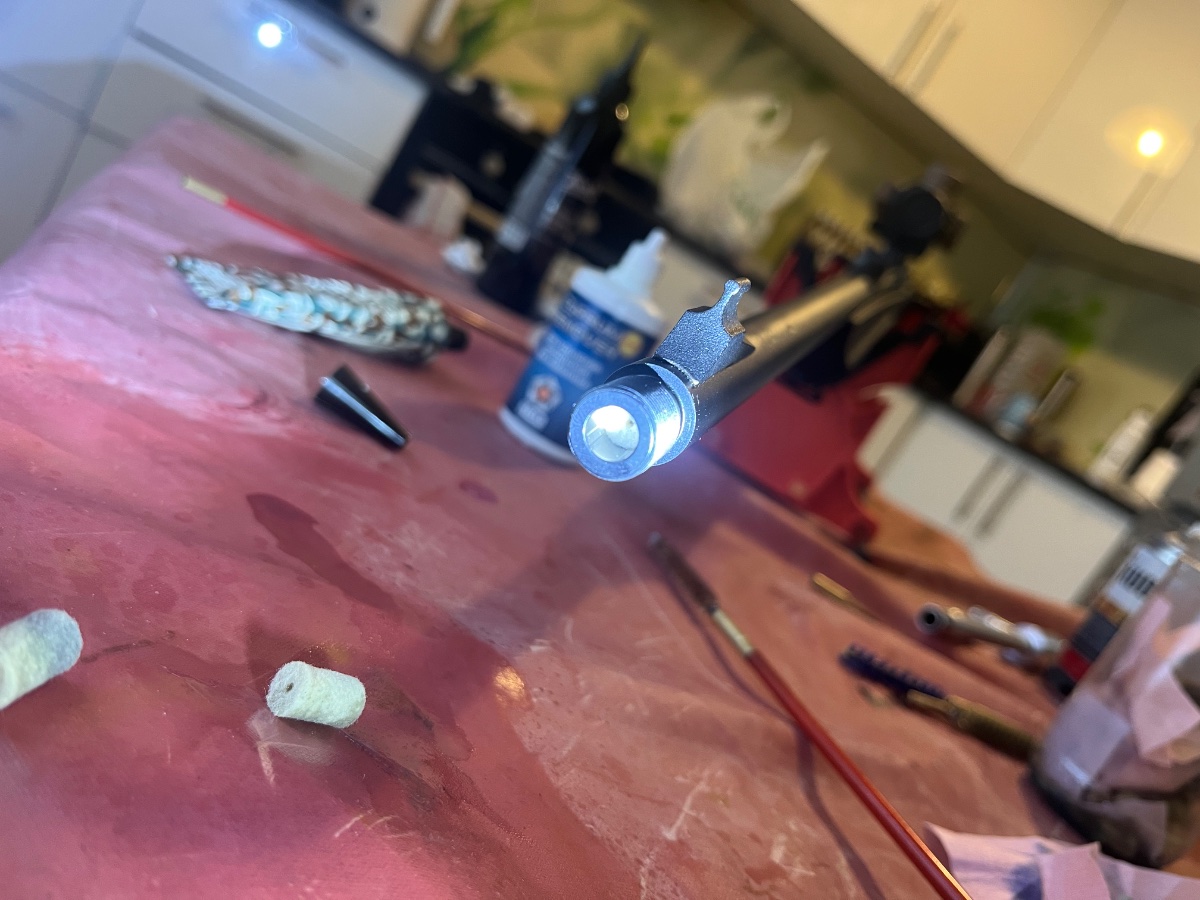 Не знаю чем поможет объяснить это фото, но пока эндоскопа нет… вот такие пятна на сантиметр в глубь ствола, дальше зеркало. Это может быть запущенная медь? просто патчи после средства от омеднения постоянно синие выходят. Если светить со стороны патронника, идеально ровный (без раковин) ствол.