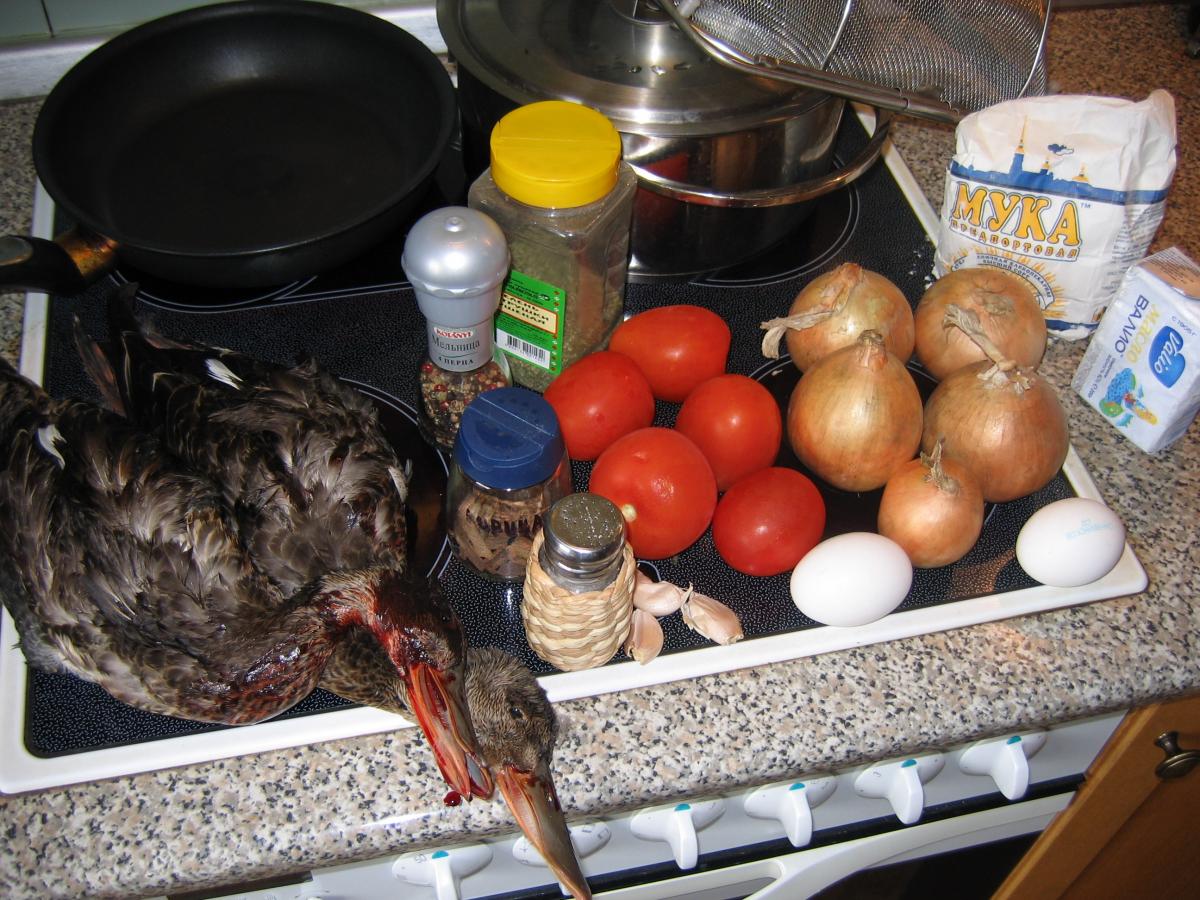 Одна кряква или два чирка или две широконоски, 2,5 л воды, 4-5 луковиц, 4-5 помидор, 3 столовые ложки сливочного масла, 1-2 столовые ложки муки, 150мл белого сухого вина, 1 яйцо, соль, перец, петрушка (свежая или сушеная), 2-3 дольки чеснока, 1/3 чайной ложки корицы (молотой без сахара или палочками).