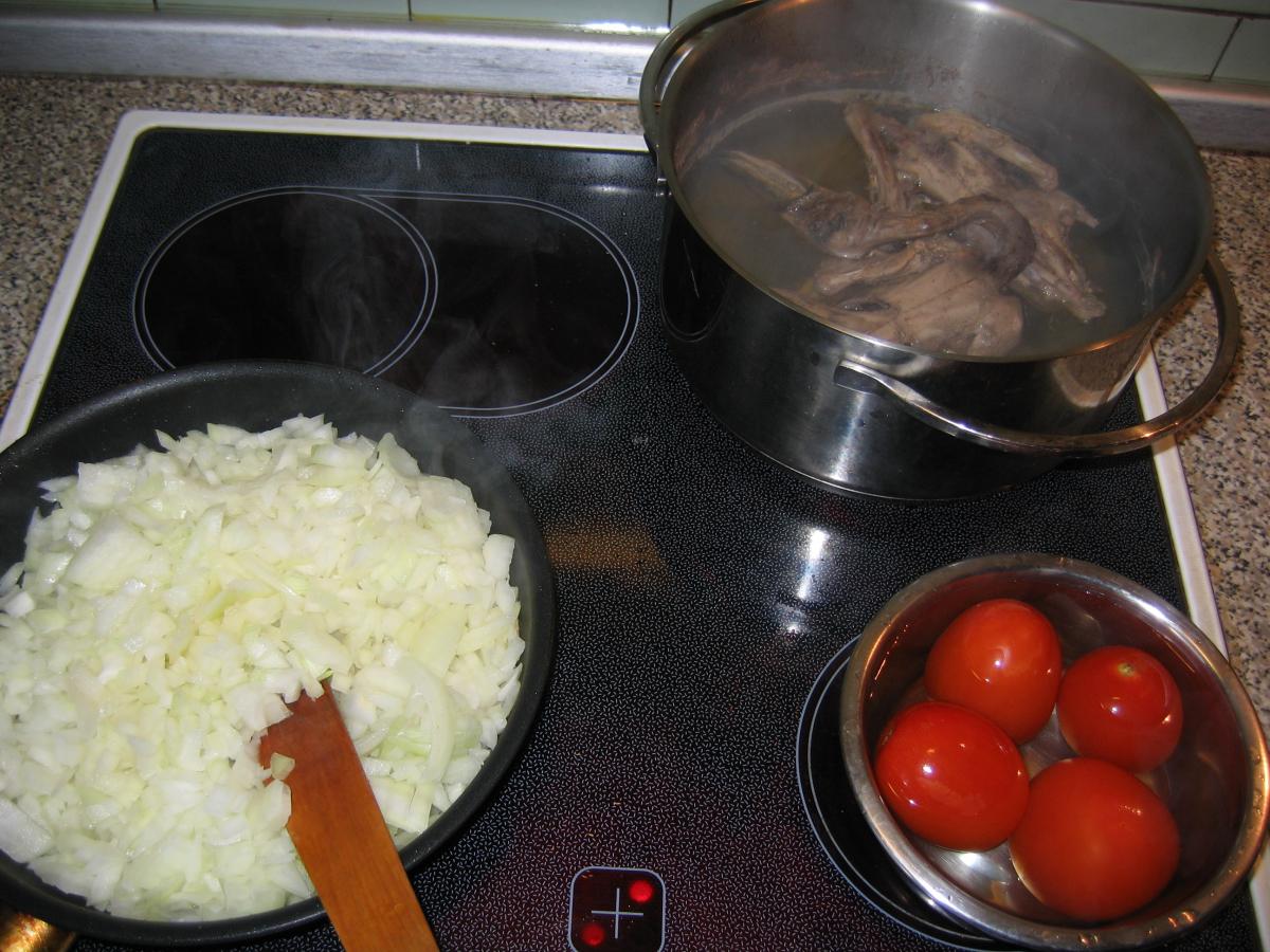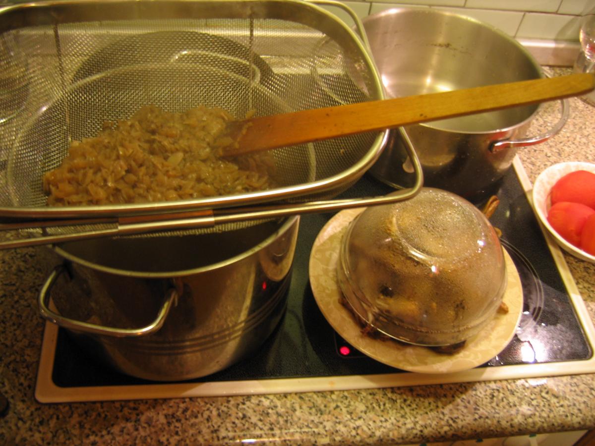 После варки ещё раз профильтруйте бульон через дуршлаг, выложив сваренные помидоры в лук.