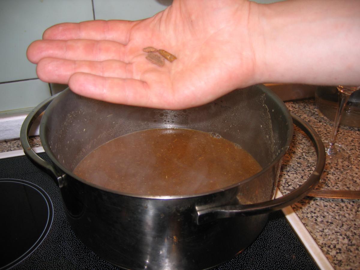 Последний раз профильтруйте бульон через дуршлаг, удалив не размешавшуюся муку. Положите в бульон корицу, пару палочек, см.фото снизу. Убавьте огонь на минимум и закройте кастрюлю крышкой. Через 3 минуты огонь выключите.