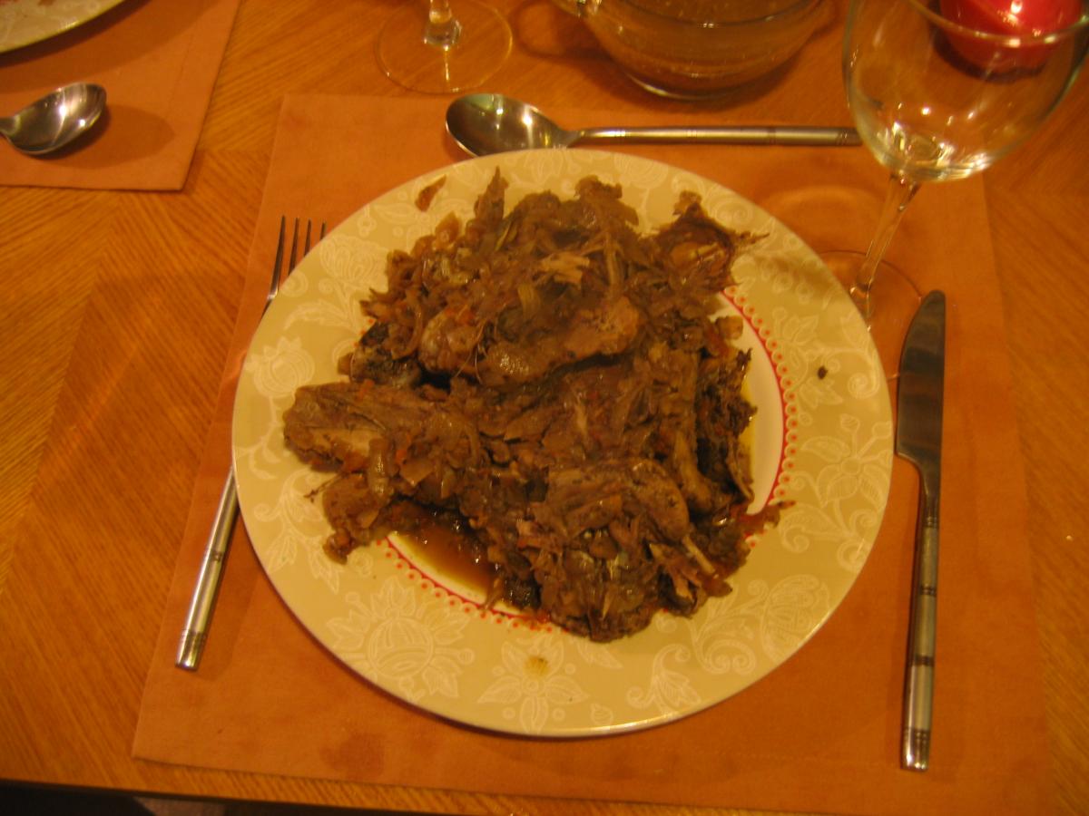 Чтобы блюдо получилось красивым (утка целой) кладите утку на лук при тушении, я же опять поленился и изменил рецепт, положив лук на утку. Результат на фото.