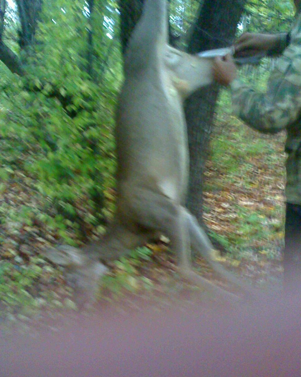 Молодой новичок потрошит косулю. Вытягивает потроха, тогда более старый кто-то спрашивает: