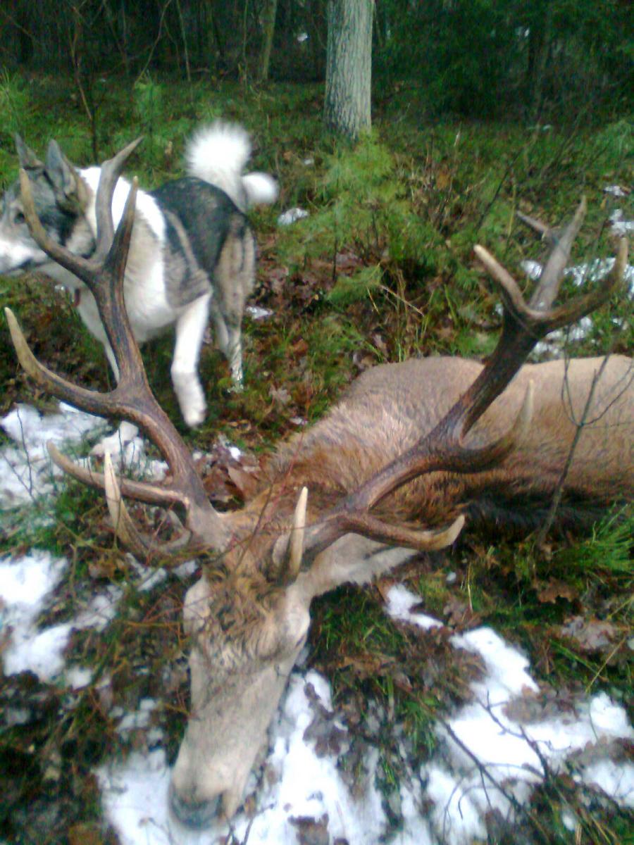- Олень, не двигайся! - я потихоньку сказал Агнешке и сам - дрылинг к глазу и я жду.... Большой бык выпал просто на нас. Могут 50 м! Ну, быстро нас увидел и пошел вправо. Гонит с коронами рогов положенными на хребет. Несколько метров слишком им, с прижатыми ушами, вытянутый в прыжке как волк - гонится оленя мой Коля. Для такого вида стоит жить! Кровь в жилах зашумела, сердце крепко ломота, в горле давка...... Который настоящий охотник этого не знает? Ну, этот что не знается с этим чувством - бедный человек. Длинное описание но это były обломки секунд. Я прицелился на легкое оленя и потянул выпуск. Выстрел громовой! Бык как будто минимально присел и немного сбился с ритма шагов. В гладком стволе была еще пуля но инстинкт говорил: хватит, не надо. Олень погнал дальше а Коля остро шел слишком им. Пробежали через дорогу и начали восходить в гору. Я внимательно смотрел на бык. Oтчетливо видел kak крутил головой так как будто хотел посмотреть свой бок. Олень и собака исчезли слишком горкой. Агнешка сказала: