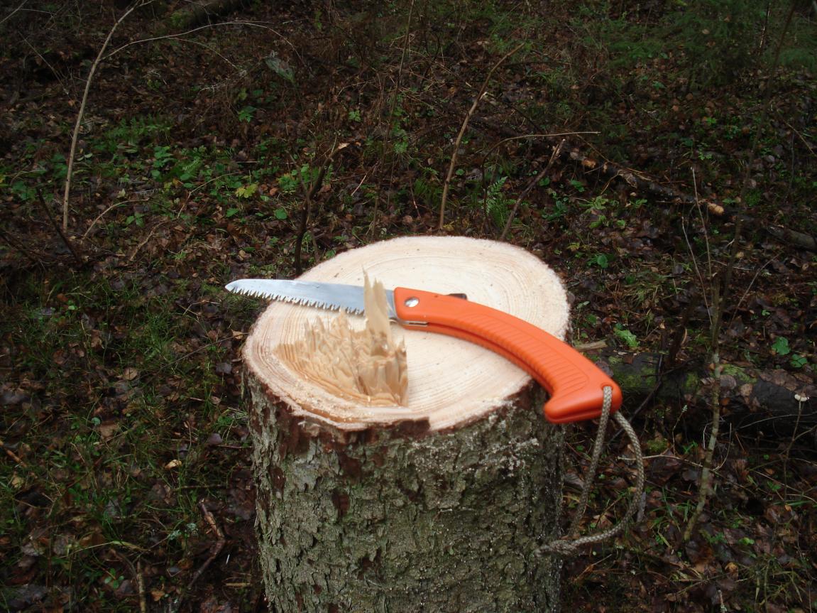 Вот спилено дерево складной ножовкой , время не засекал , но бысрее чем топором , сделать еще два реза , для нодьи не составило бы труда . Ненадо на нее нажимать сверху она и так пилит зашибись , думаю что Силка будет пилить еще лучше . Летом при строительстве вышки на кабанов использовал эту и лучковую , не заметил особого преимущества лучка .