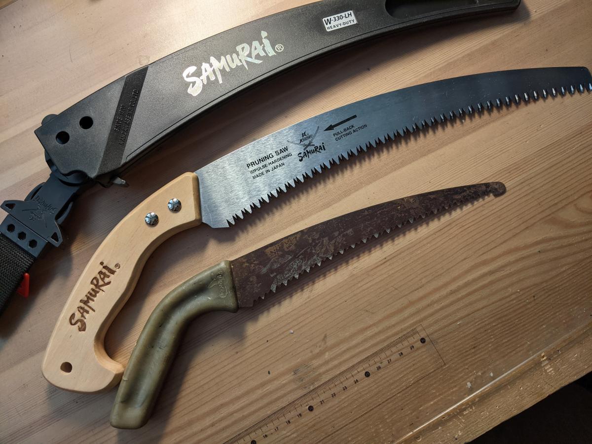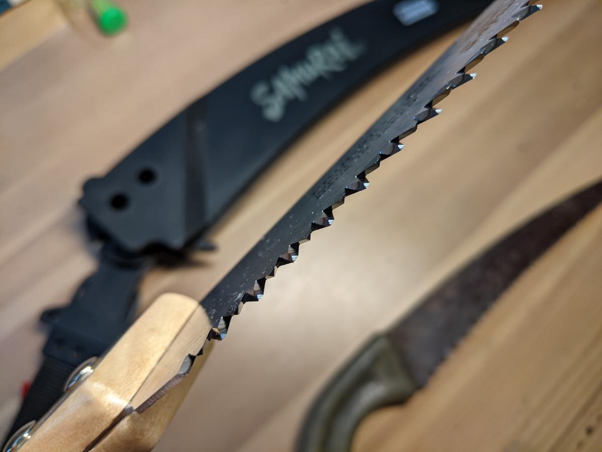 Угу, и я. Была Леруашная садовая, хотел что-то подобное но поострее. Как-то Всеинструменты барыжили фирмой Grinda, типа сделано в Германии, но не было в наличии и я не стал ждать под заказ. А теперь взял Самурая изогнутого 330мм, толщина 1.2мм. На вид Китай среднего пошиба, обушек лезвия весь корявый. Пилит понятное дело зло, вопрос как быстро сядет. Новый конечно блестит, но что-то в добротный слой хрома при общем качестве не верится. Ножны как не родные, болтается и выпадает.поддался общему ажиотажу и купил себе новый блестящий самурай. + 10см. затестим этим летом.