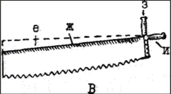 е — участок пилы, удаляемый для облегчения инструмента; ж — заточенный край тесака; з — ручка для работы пилой; и — ручка для работы тесаком