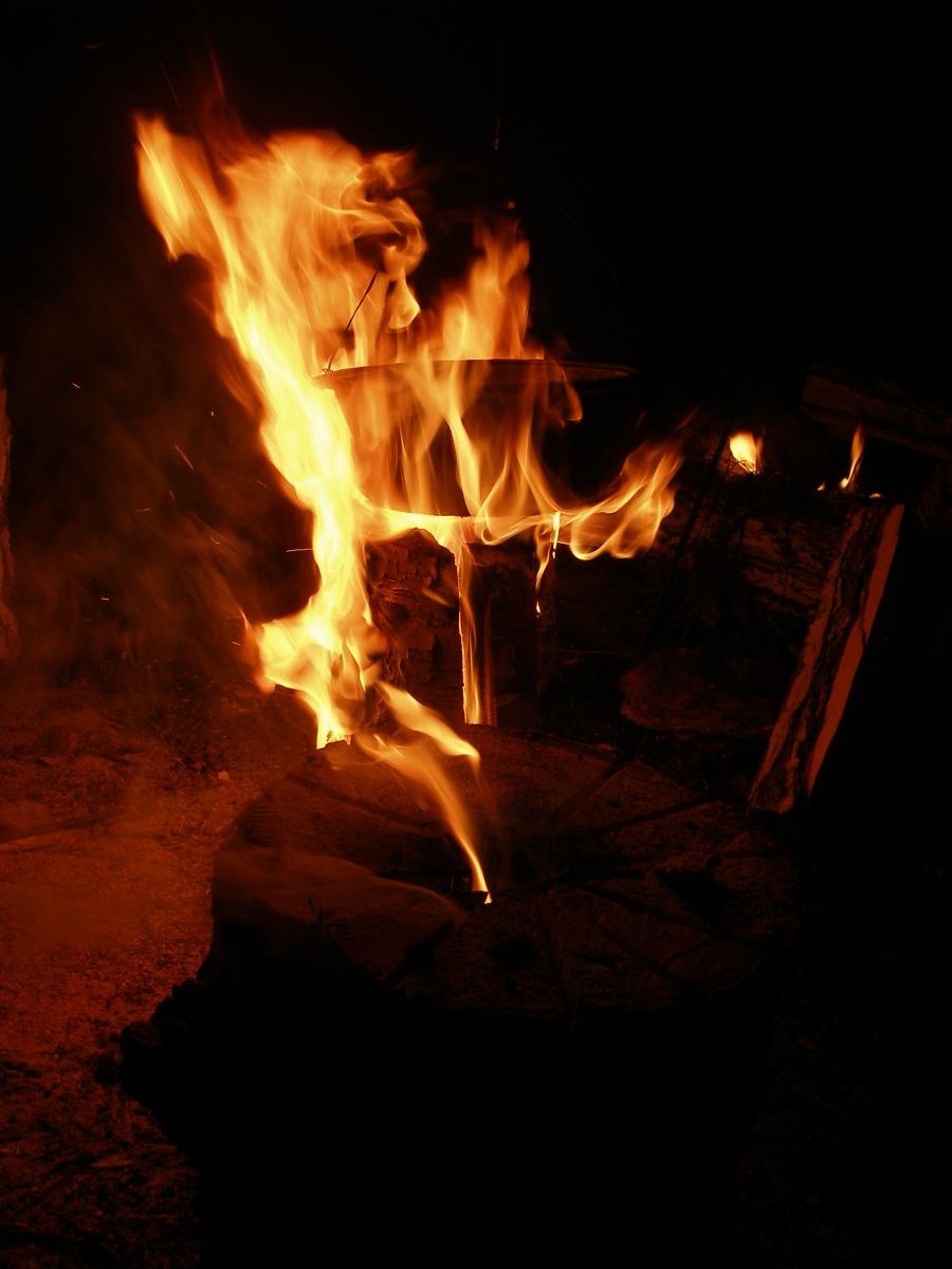Результатом я так же был удивлен, как и в первом случае. «2 литра» дров горели стабильным пламенем минут 50 в виде «индейской свечи», после чего еще минут 10 дотлевали угли в печке, ставшей мангалом. За это время я даже успел выгнуть из проволоки подставку для посуды и сварить килограмм картошки в мундире в котелке!